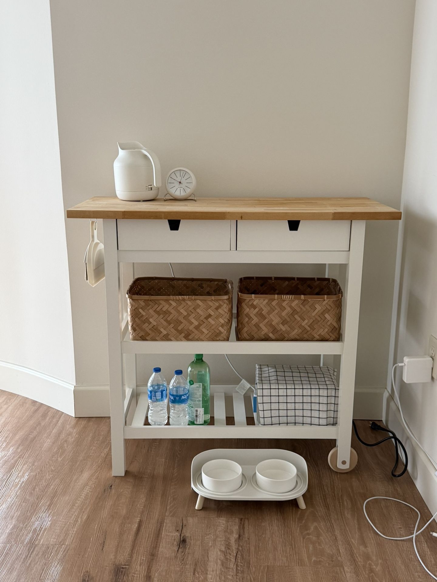This is an IKEA FÖRHÖJA kitchen cart. As shown in the photos, it has some signs of use, but nothing major—if you'd like it to look refreshed, it can be easily touched up with gesso or a bit of paint. The cart is sold fully assembled, and you'll need to pick it up yourself. I can help load it into your car. I also added a small hook on the side of the top panel for convenience. Dimensions: • Length: 39 3/8" • Width: 16 7/8" • Height: 35 3/8" *If you have any questions, feel free to text me anytime*