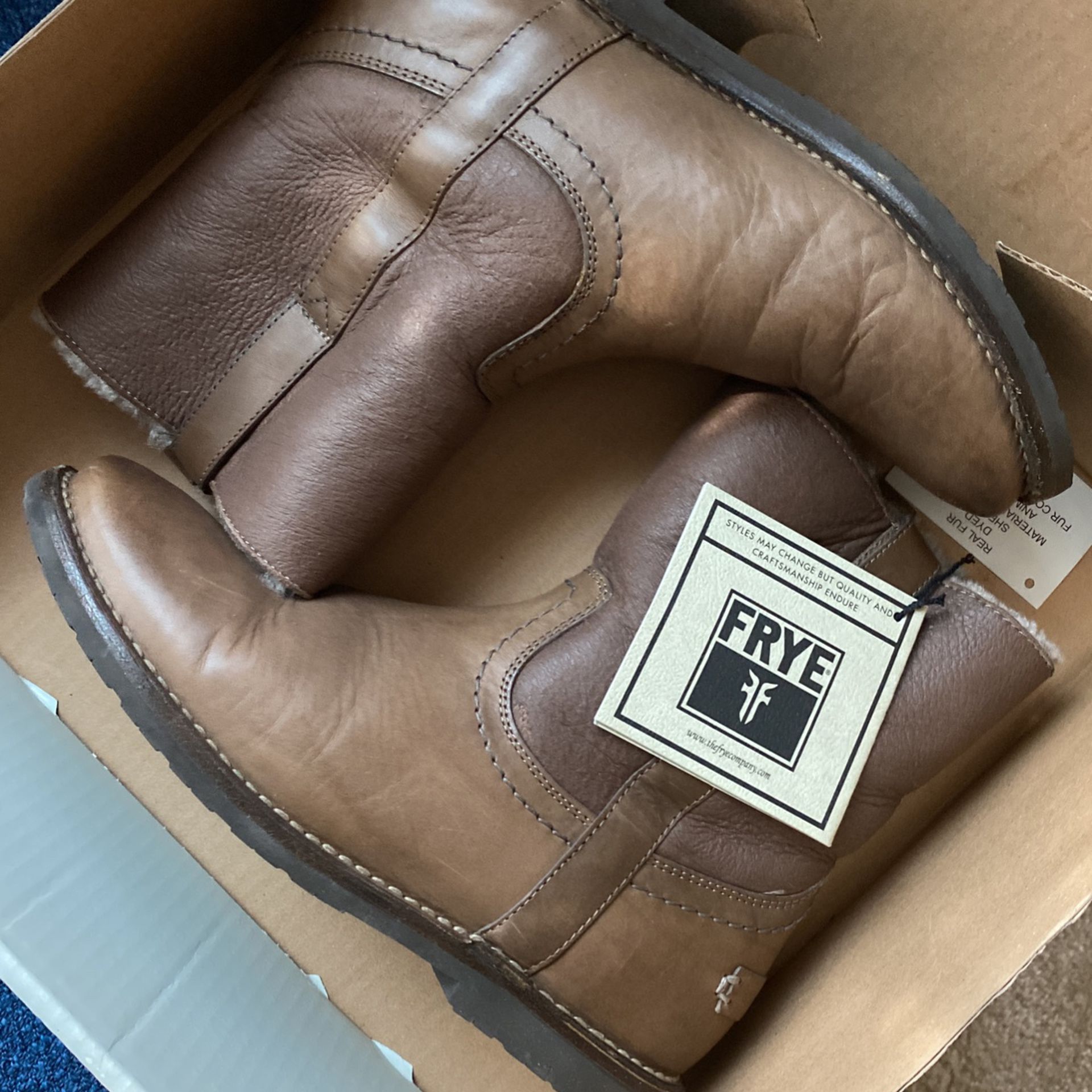 Frye leather boots in original box. Women’s size 8 I love Frye shoes, they’re always beautiful and well crafted however I’ve come to find out my feet are just a tad bit too wide. I wore these a couple of times around the house- as you can see the sole is clean. The leather is VERY soft and all parts are genuine (leather, shearling). Paid $199 for them when they went on sale around Xmas.