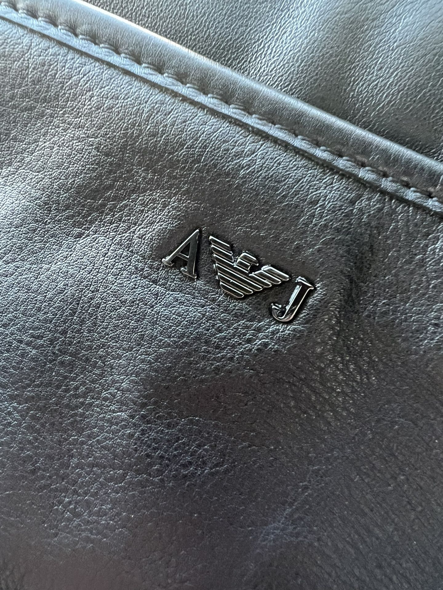 Genuine leather with zipper closure. Front pocket and another zippered pocket inside.