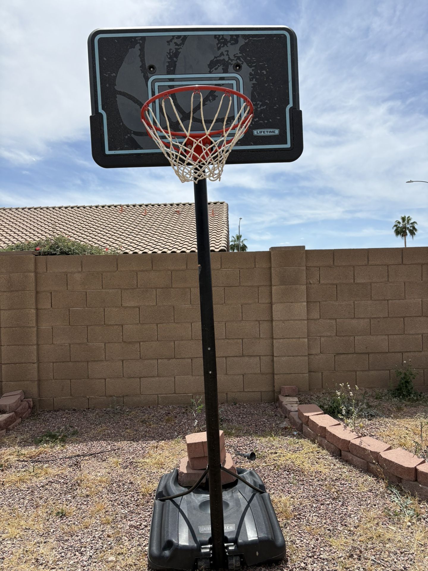 Portable basketball hoop with 44-inch back board. In great condition, we need to make space for another hoop.