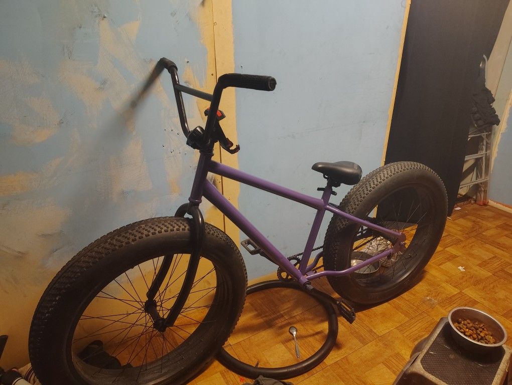 26x4 inch wide tires, bikes actually fast just takes some getting used to the weight but I get LOTS of compliments. Great bike supper clean