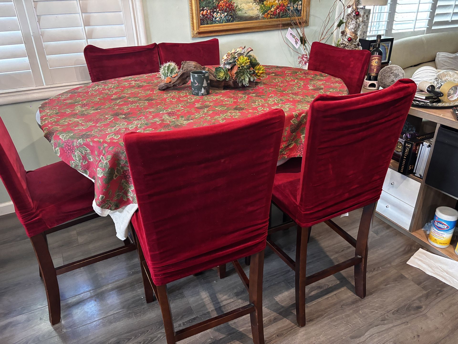 The base of the chairs have scratched on them because of my cats, but that’s why I’m giving the velvet covers for free. It cost me $40 for those alone.