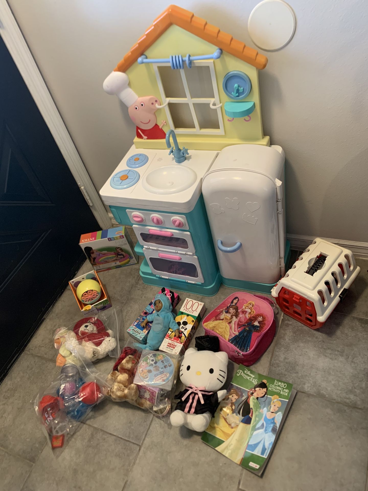 Includes Peppa Pig play kitchen, plush toys, Disney Princess items, and more. Mostly Preloved items however the pool and bubble maker are new never opened. Located in 32828 Kids Toy Bundle with Play Kitchen