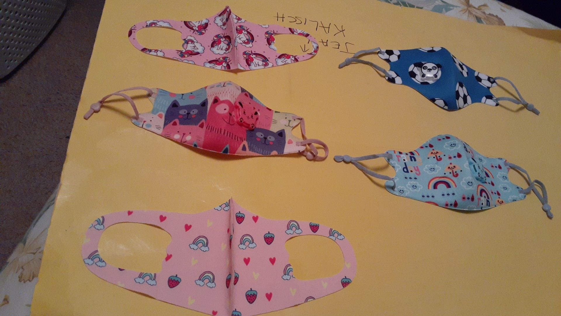 FACEMASKS FOR LITTLE CHILDREN ONE SIZE. THIS FOR DISPLAY UNOPEN ONES ARE AVAILABLE. $4 EACH. WASHABLE.