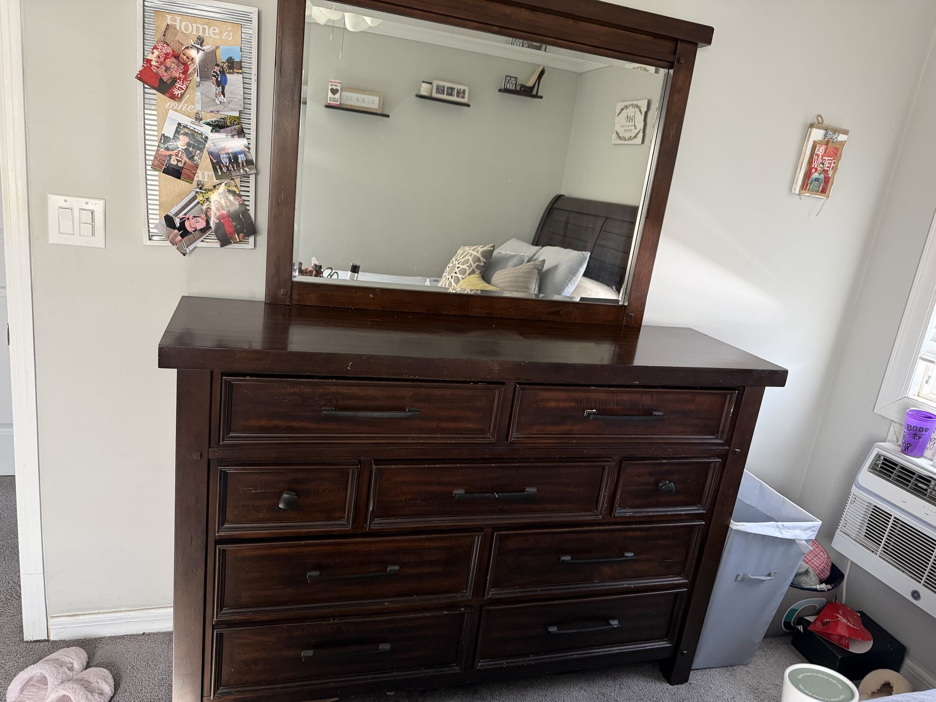 Queen size bedroom set with matching dresser and mirror. Bedroom set has six large drawers underneath the bed. Mattress also available. Pick up in Commack willing to take best offer.