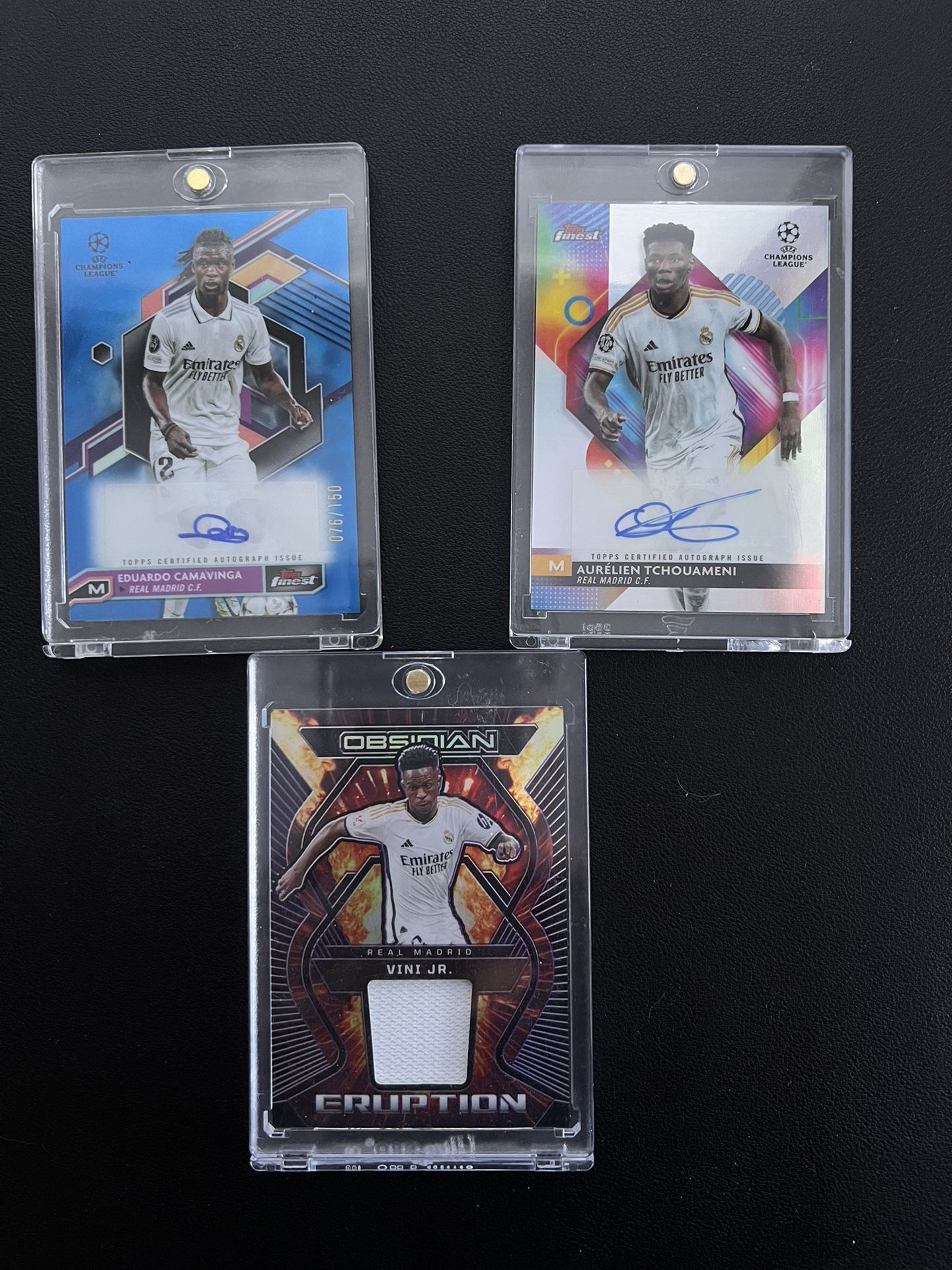 Price is for all 3, will negotiate prices for individuals. Panini Obsidian - Eruption Vinicius Jr. #ER-VJR /50 Topps Finest UCL Eduardo Camavinga A-EC /150 Topps Finest UCL Aurelian Tchouameni A-TC Tags: sports cards. Soccer. football. Sports cards. Madrid. World Cup. Brazil. Brasil. France.