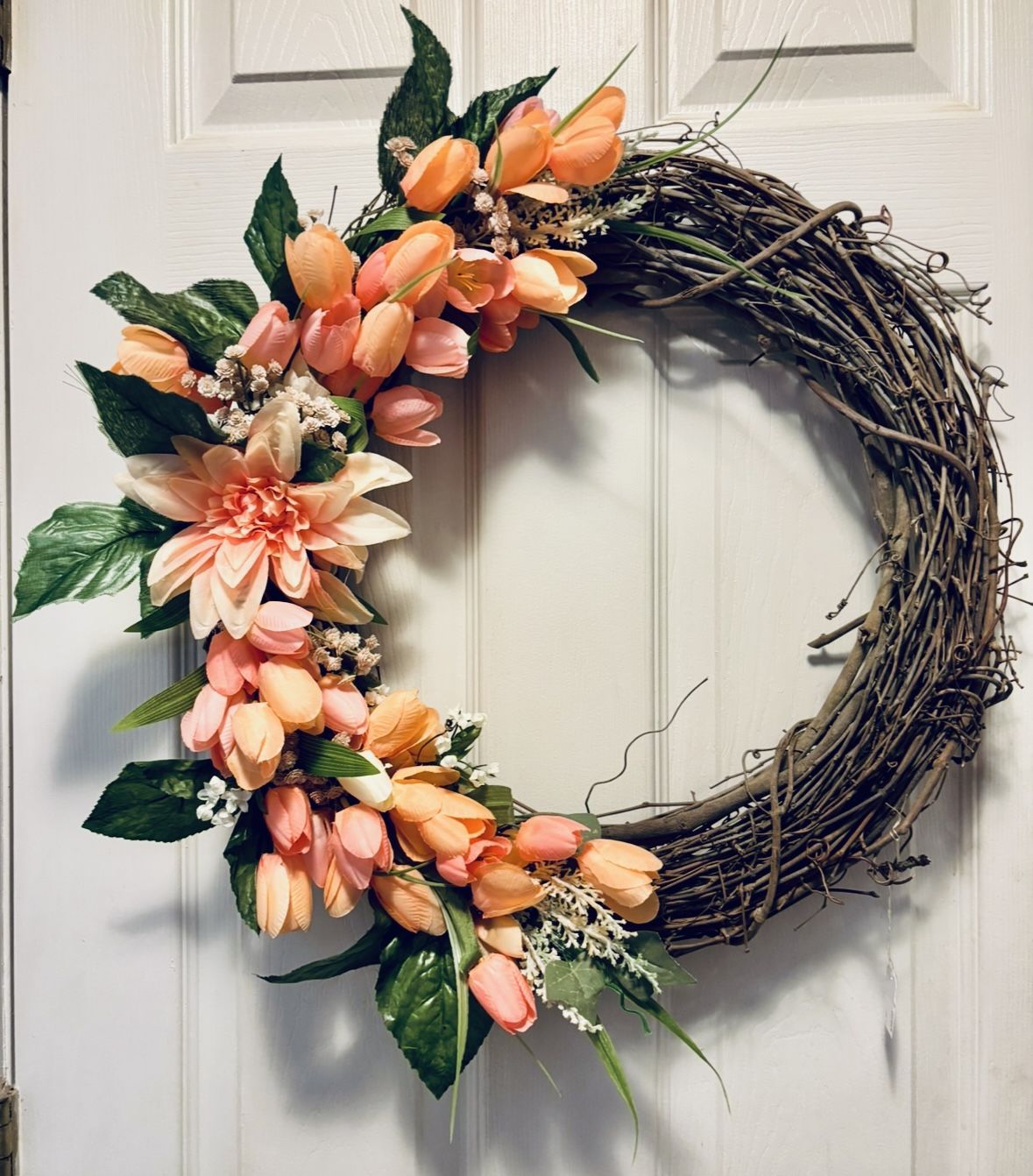 Wreath for front door 22” New. Faux silk peach color tulips. Ships in its own box. Cones from a smoke free environment.