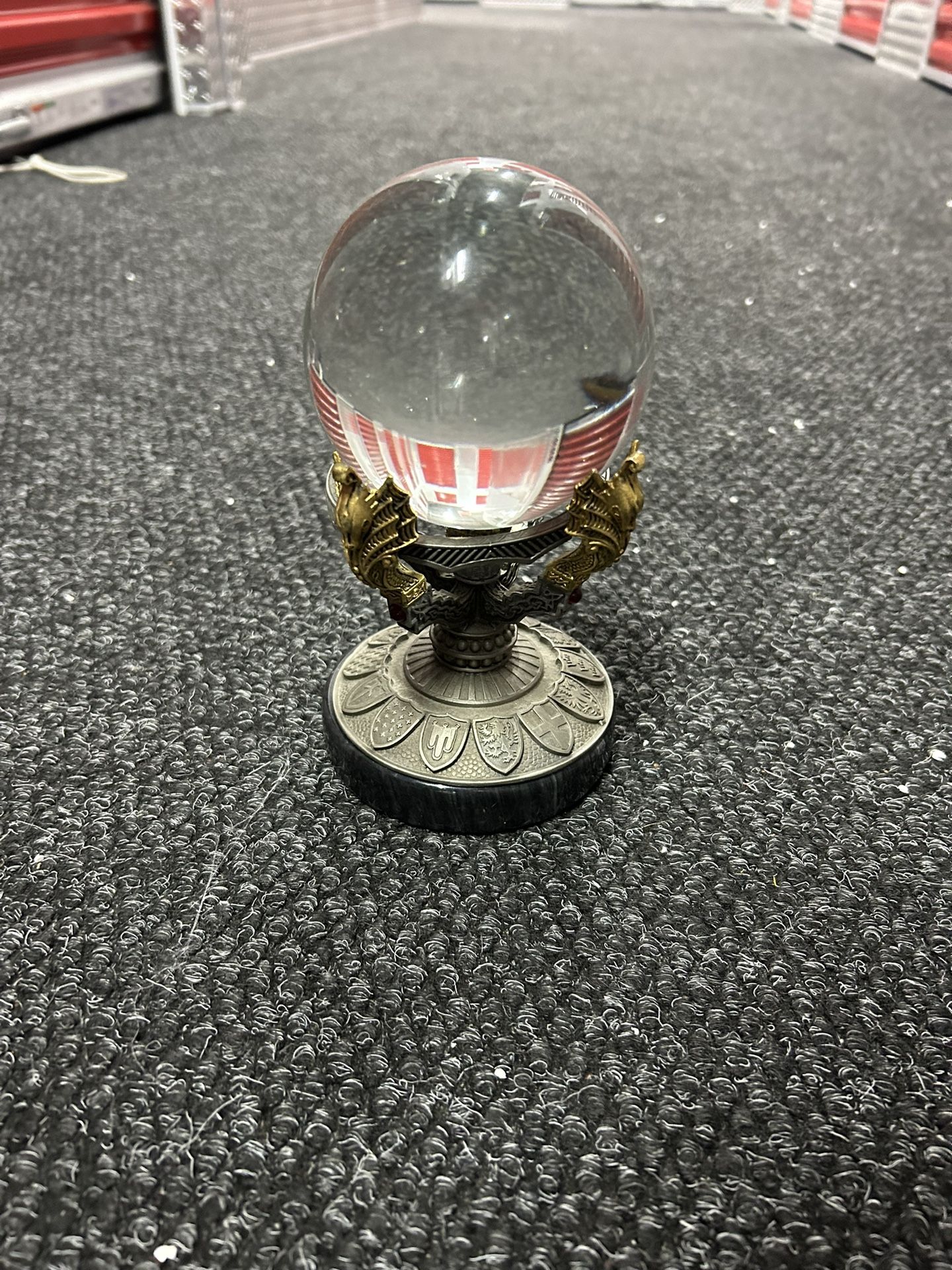 The ball is glass and is heavy, probably 2-3 pounds. Comes with base and platform shown.