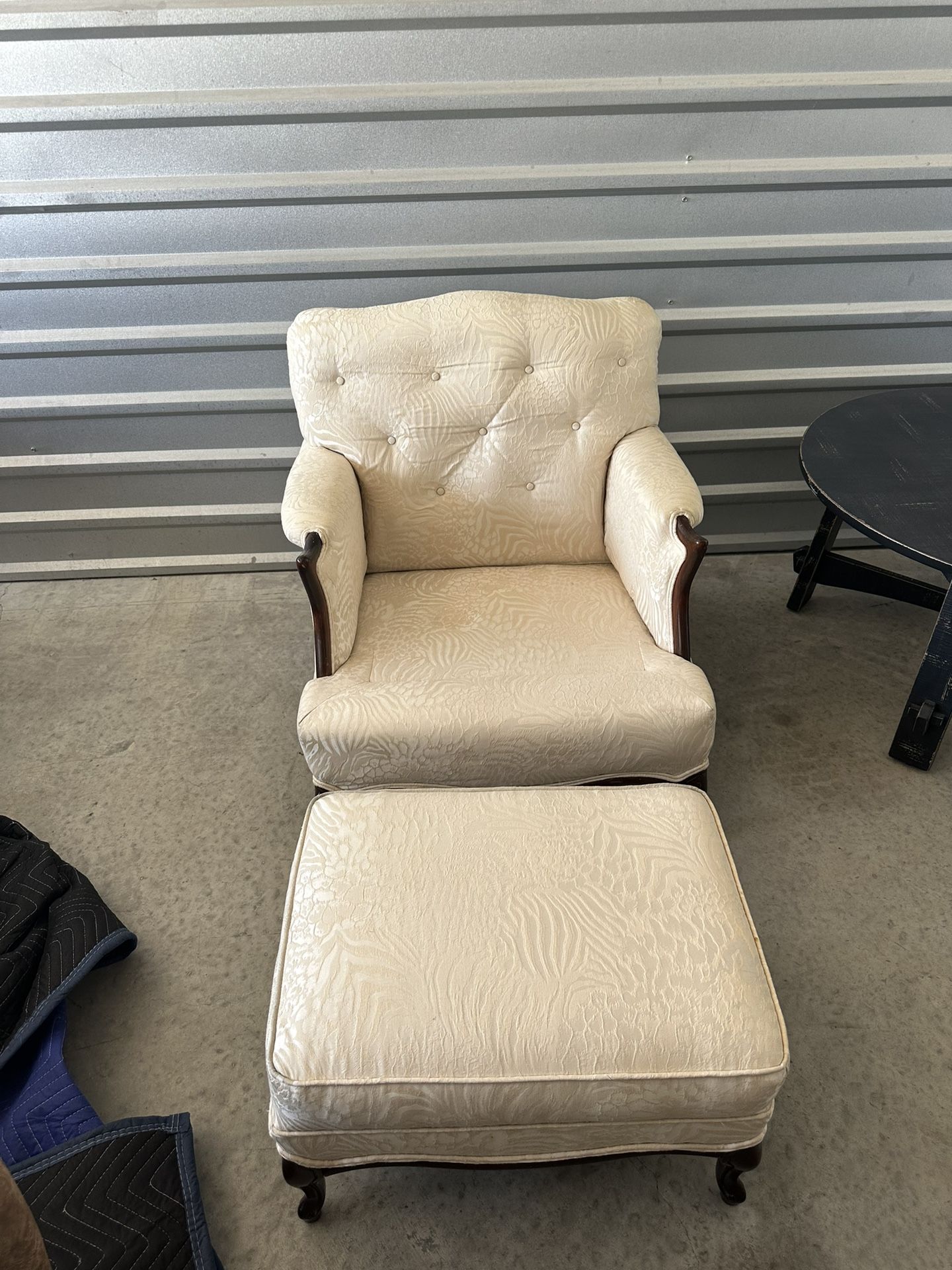 This elegant cream-colored armchair with matching ottoman features a subtle textured floral pattern and curved wood trim on the arms and legs. The tufted backrest adds a vintage charm, while the cushioning is still supportive and comfortable. Great for a reading nook, guest room, or classic-style living space.