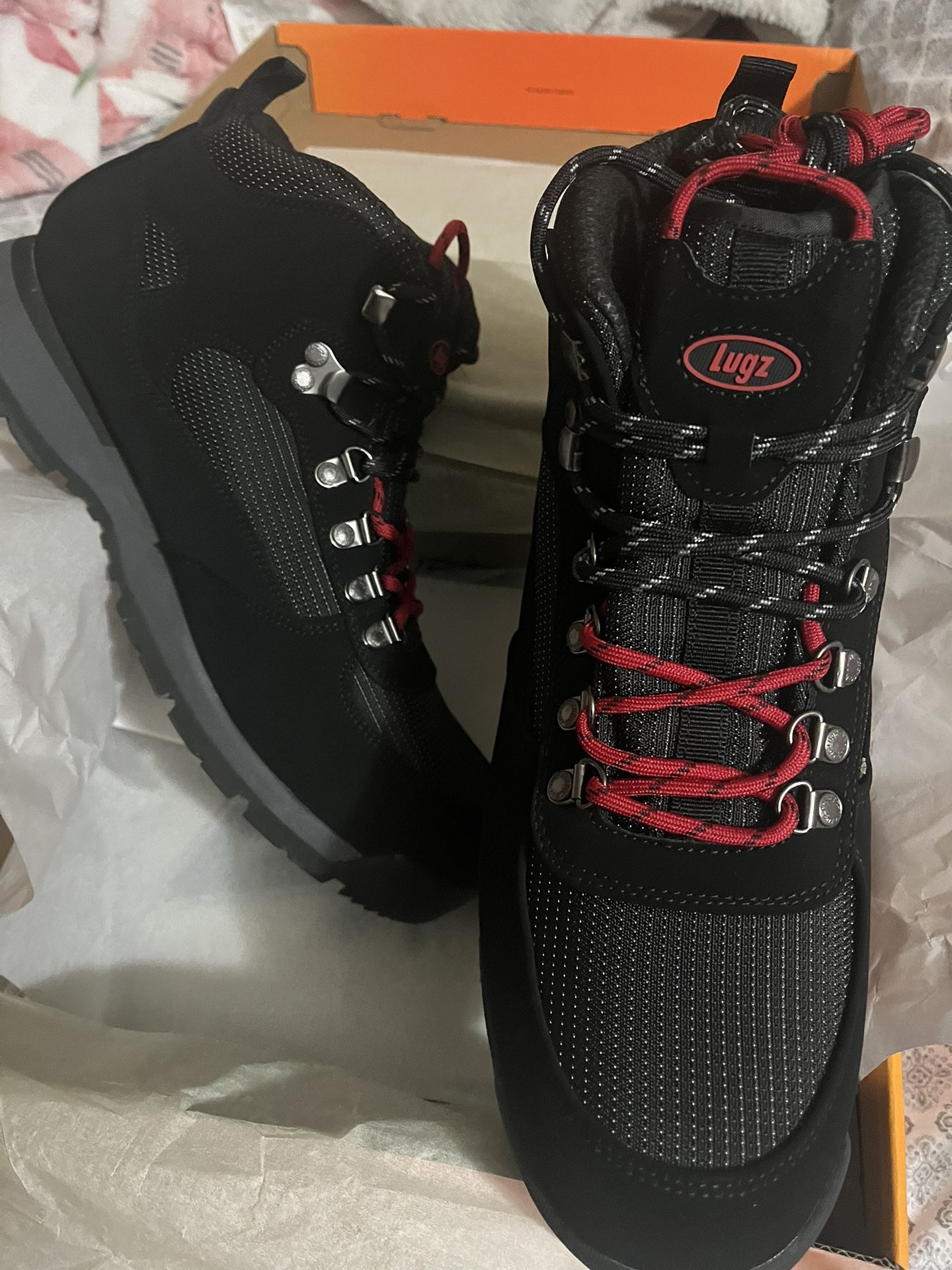 Brand new, size 12 Lugz boots. Can be use for work or hiking. They are slip resistant as well. Notes: * Cushioned Insole for added comfort * Sythetic Nubuck Leather Upper * Slip resistant durable rubber outsole * Lace-up and speed hook closure for an adjustable, secure fit, featuring custom eyelets and classic hardware *Breathable lining * Padded collar and tongue for a comfortable fit