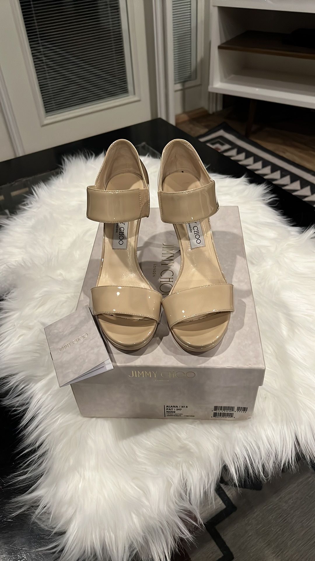Jimmy Choo, Alana Patent Leather Nude Sandel, 37.7 Or 7-8size