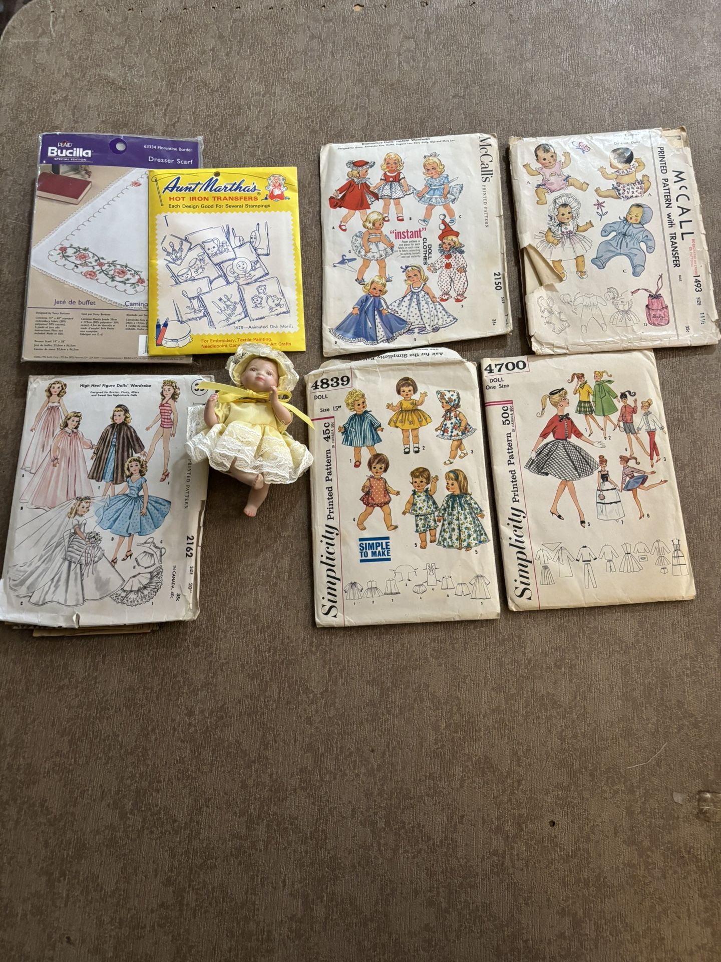 Estate sale one lot of 4” porcelain doll and multiple Vintage doll patterns. SEE PHOTOS. Patterns sell between $15 & &30 each. Doll is porcelain 4” baby with damage to one leg. Patterns show wear. Everything sold as is.