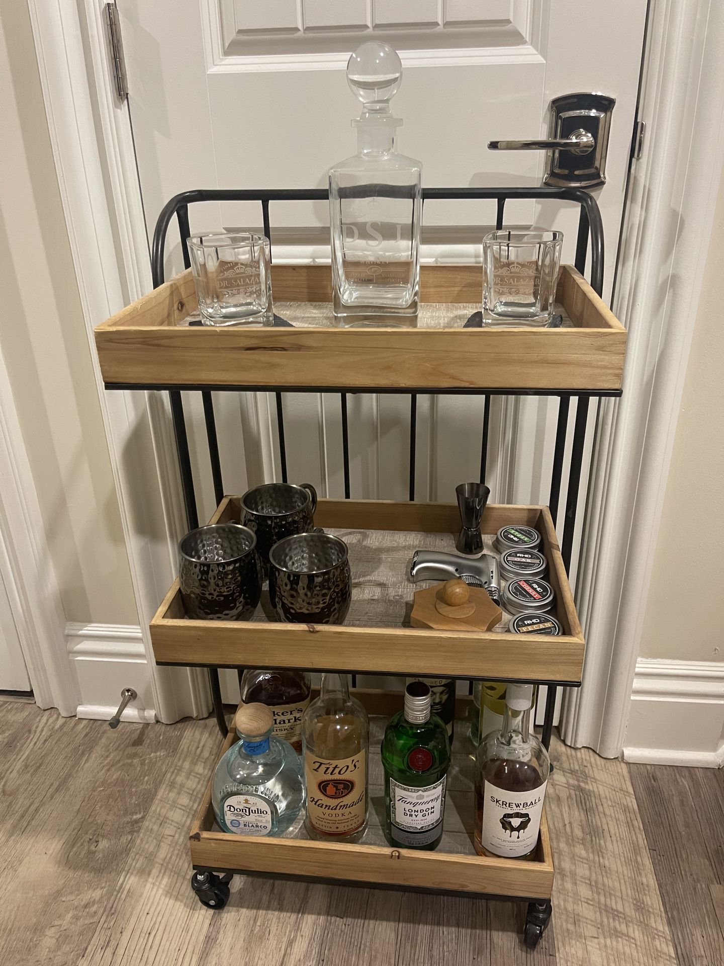 Industrial-style 3-tier bar cart with wood shelves and black metal frame. Dimensions: 19” L x 12” W x 34” H 3 spacious tray-style shelves Smooth rolling wheels (easy to move) Rustic wood + metal design Great for bar setup, coffee station, or storage Very sturdy and in great condition. Only selling due to upcoming move.