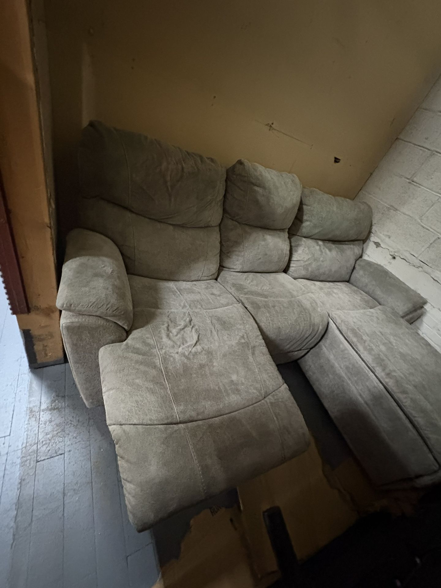 Almost brand new Lay-z Boy couch with recliner that goes all the way back. The most comfortable couch I had which is why I put it in storage when I had to move. Clearing storage unit out so must go today. Nothing wrong with the couch. No rips no stains. I had it custom made to fit my apartment to get it up the stairs. It comes a part in 2 pieces. Warning if you take a nap on it before work, you might not wake up in time. It’s that comfortable