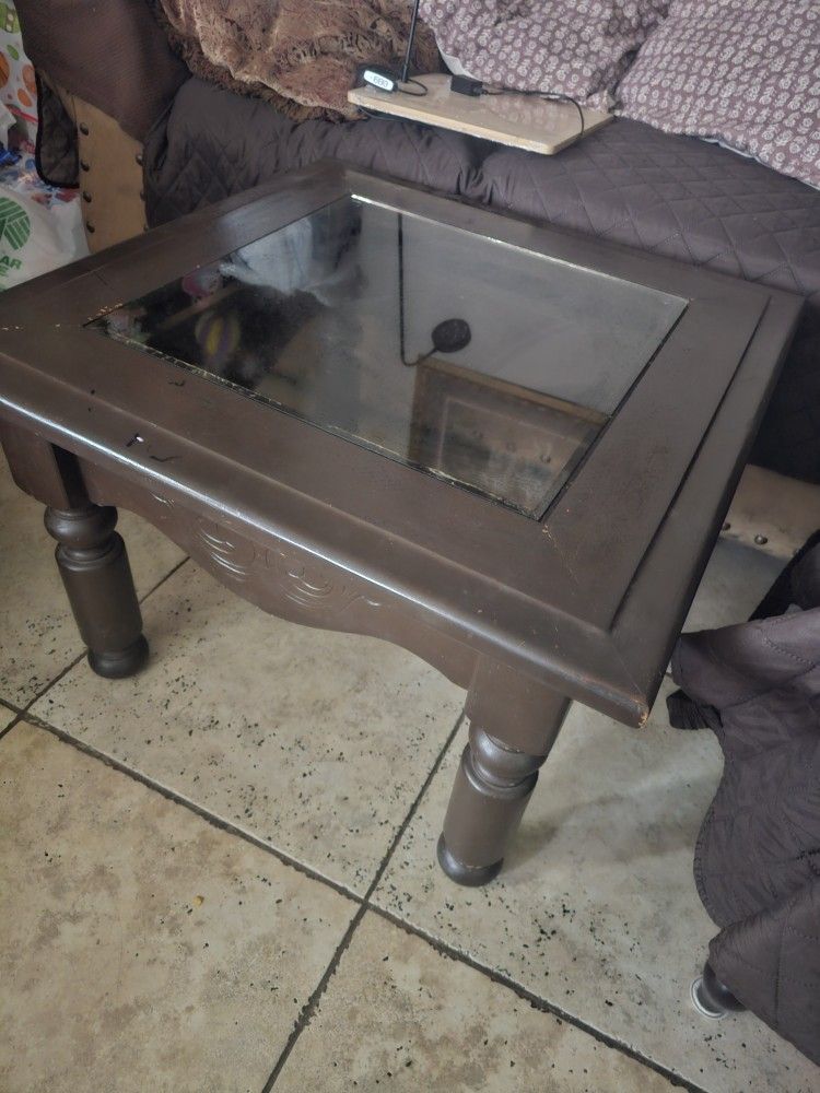 Nice wood with glass in the middle center table in good fair condition, color dark brown measurements. Are in pictures Serious buyers only please