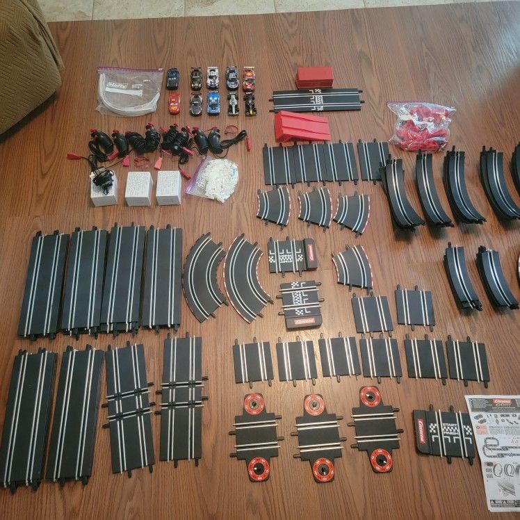 For sale 5 tracks. The parts listed are as follows: 24 ea 13 1/2 inch straights. 2 ea 13 1/2 inch 4 way crosses. 3 ea 4 1/2 start finish shorts. 3 ea 4 1/2 inch lap counters. 8 ea 4 1/2 short track pieces. 6x4 ea big loop sections. 8 ea short loop pieces. 6x4 ea 12 1/2 inch radius pieces. 1 ea 13 1/2 inch straight pieces with battery box. 2 ea ramps. 4 ea 6 1/2 inch radius pieces. 4 ea 6 3/4 inch short track pieces. 8 ea controllers plug in. 3 ea ac adapters. Approximately 100 plus rail clips. 24 ea rail stripes. 10 ea 1/43 cars for track. With one more if pay an extra $50 for a Dale Jr car. 3 ea large track locks. 3 ea small track locks. 16 ea 3 inch loop supports. 9 ea 2 inch loop supports. I broke two track tabs when first and only time used. This is pretty much brand new, only set up 1 time, then torn down and stored. Smoke-free environment. For sale $300 plus shipping or free pick up. If Dale Jr car is added, $350 plus shipping or free pick up. This is in Port Saint Lucie FL 34953.