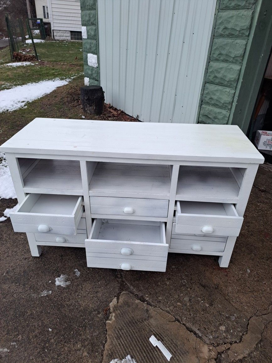 6 Drawer Craft 50 Inch Media Console /Lau.dry TV Stand In White. This handsome stand is solid real wood. Very well made. Has natural wood pitted facing. Measures 50" wide x 30" tall x 18.3/4" deep. Side sections measure 12"w x 8" h x 17"d center section is 13"w x 8"h x 17d Top Has a few light stains but it is naturally discolored and pitted.