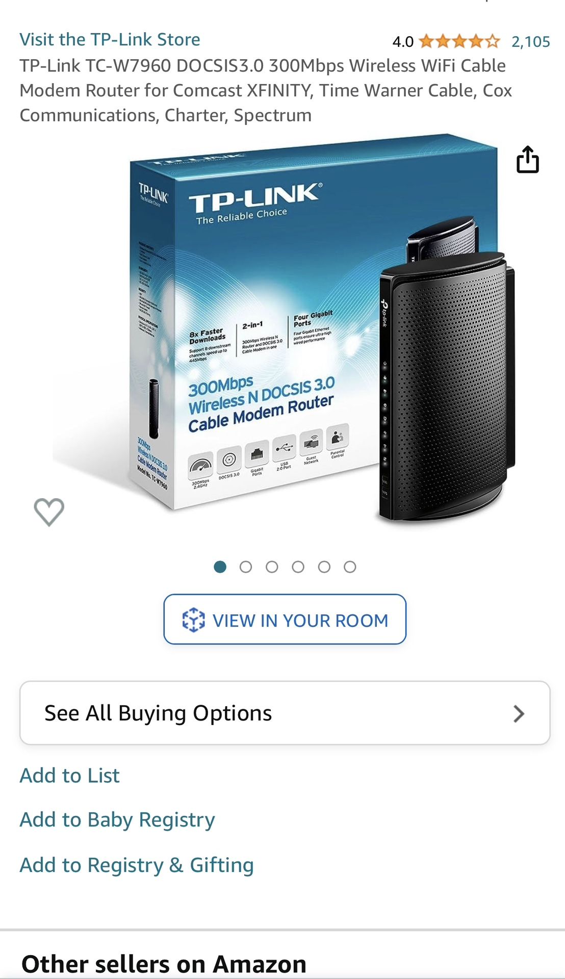 TP-Link TC-W7960 DOCSIS3.0 300Mbps Wireless WiFi Cable Modem Router for Comcast XFINITY, Time Warner Cable, Cox Communications, Charter, Spectrum