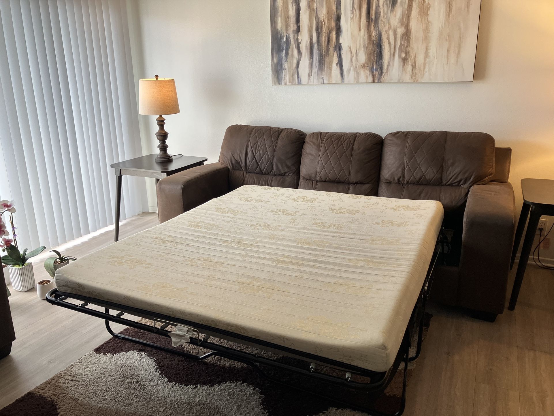 $400 ... Comfortable two sets of brown loveseat and a sofa bed, with matching side tables.