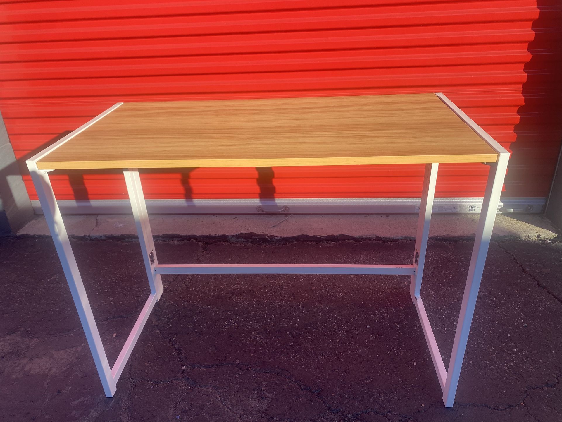 folding desk for small space- white base with wood grain top that folds and locks in place. gently used in near perfect condition. lightweight and easy to carry. can be used for small office, studio, kitchen, vendor markets…
