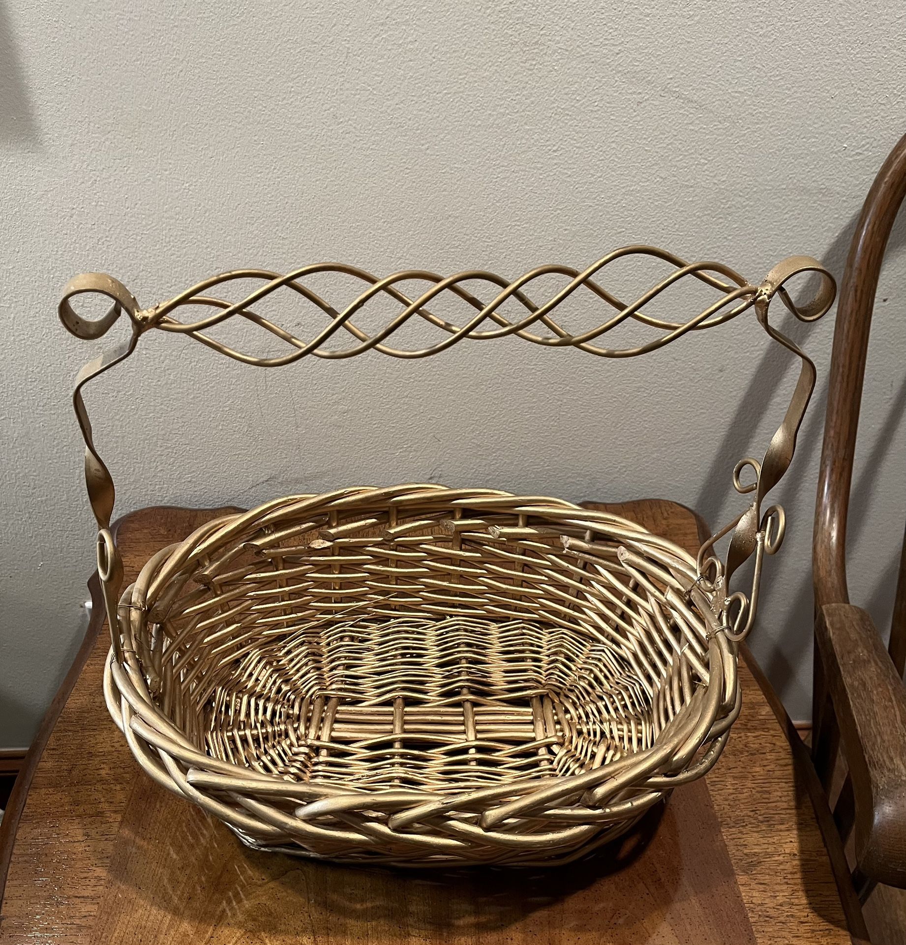 This beautiful vintage wicker hanging basket features a sturdy metal handle with a striking gold-painted finish. The basket’s intricate woven design, combined with its durable steel handle, adds a rustic yet elegant touch to any space. • Condition: Good; minor age-related wear on the paint • Material: Wicker body with a gold-painted metal handle • Style: Vintage farmhouse or cottage decor • Use: Decorative wall basket, perfect for holding plants, flowers, or other small items This versatile and charming piece is perfect for vintage-inspired home decor or as a functional accent in any room.