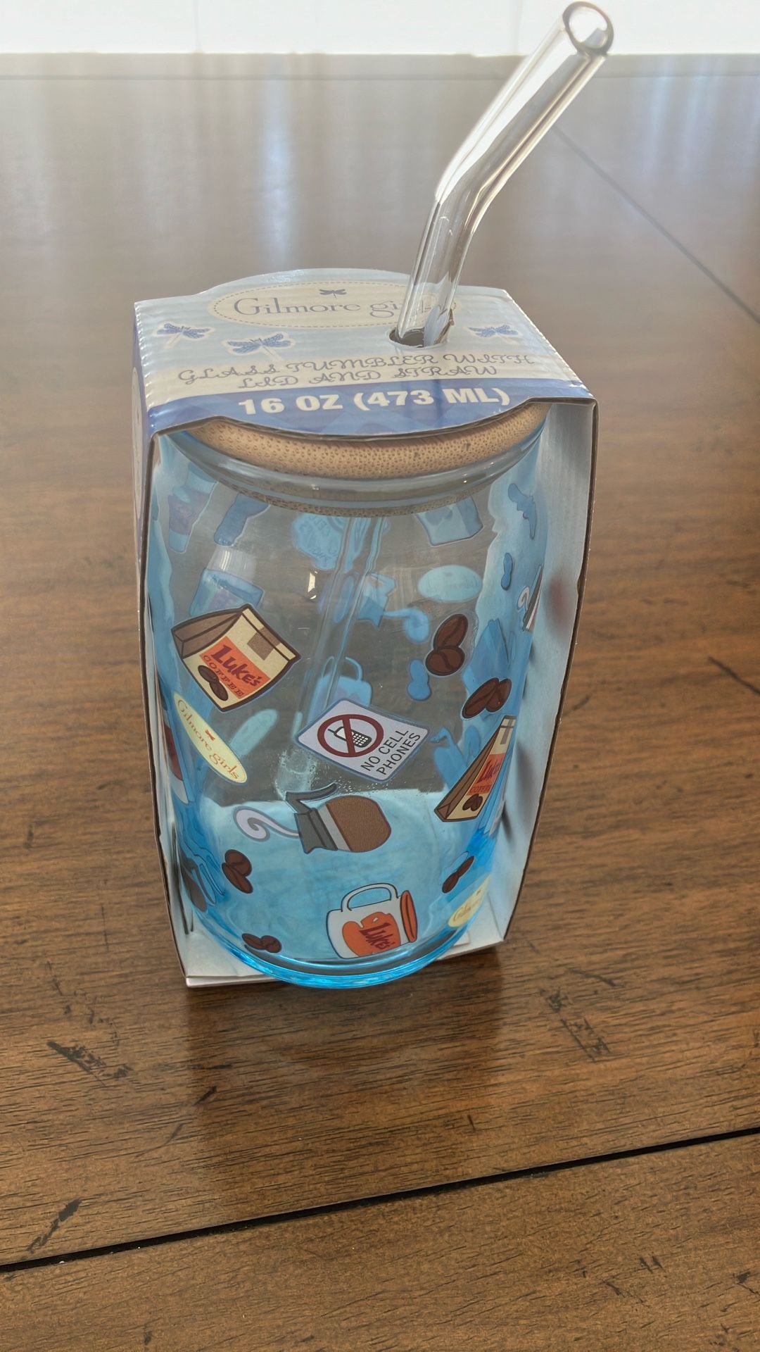 "Where you lead, I will follow..." — specifically to the coffee pot! This officially licensed Gilmore Girls glass tumbler is a must-have for any Lorelai or Rory enthusiast. Designed in a beautiful sky blue tint, it’s covered in classic show icons that will make you feel like you're sitting right at Luke's Diner. Product Details: • Capacity: 16 oz (473 ml) — the perfect size for an iced coffee or your favorite "Founder's Day" punch. • Material: High-quality glass with a natural bamboo lid and a durable clear glass straw. • Design: Features iconic graphics including the Luke’s Diner logo, coffee carafes, dragonflies, and the "No Cell Phones" sign. • Condition: Brand New in original packaging.