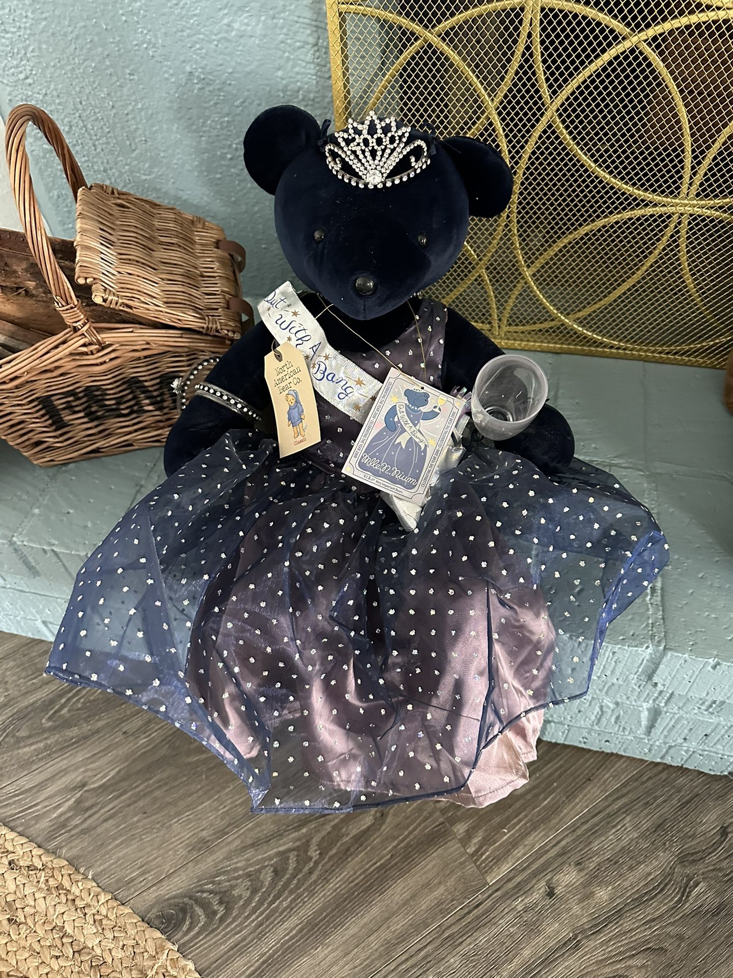 This is a limited edition North American Bear Co. Mlle. N. Nium Millennium "Out with a Bang" collectible bear. It was issued in celebration of the year 2000. The bear features dark velvet fur and is dressed in a navy blue sparkly dress with a tiara, necklace, sash, and a small champagne glass. It is a retired collector's item, with only 4,000 units produced, making it a limited edition item. Approx 20” tall All tags attached