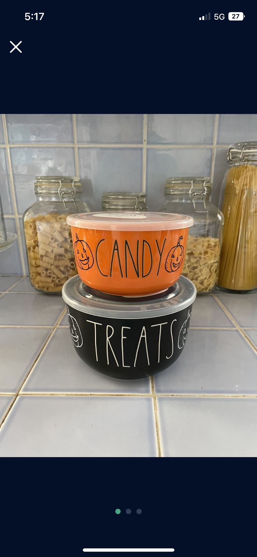 Rae Dunn Halloween Treats Candy Ceramic Round Storage Set Vented Lids 2021 NEW. Set of 2 ceramic bowls with vented lids. Orange CANDY measures 5.5" round and 3" deep. Black TREATS measures 6.5" round and 4" deep. About Rae Dunn Candy and Treats Rectangle Storage Set - 2-Piece Excess. Keep Halloween goodies fresh with Rae Dunn's Candy and Treats round storage set, crafted from glazed ceramic. Glazed ceramic construction Plastic lids Set of two containers