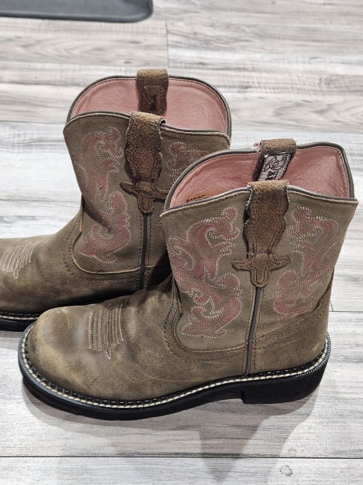 Ariat Fat baby Boots Women's Size 7 B Saddle Brown Leather Pink Western Riding Boots are in very clean, like new condition. The Ariat Fatbaby Boots are stylish women's western riding boots in size 7B. These saddle brown leather boots feature a round toe, low heel, and Western stitching accents, making them perfect for casual, workwear, or party occasions. With a comfortable pull-on design and moderate cushioning, these mid-calf boots are both practical and fashionable. The durable rubber outsole ensures stability, while the leather lining and insole provide added comfort. Perfect for year-round wear, these Ariat Fatbaby Boots are a versatile addition to any wardrobe.