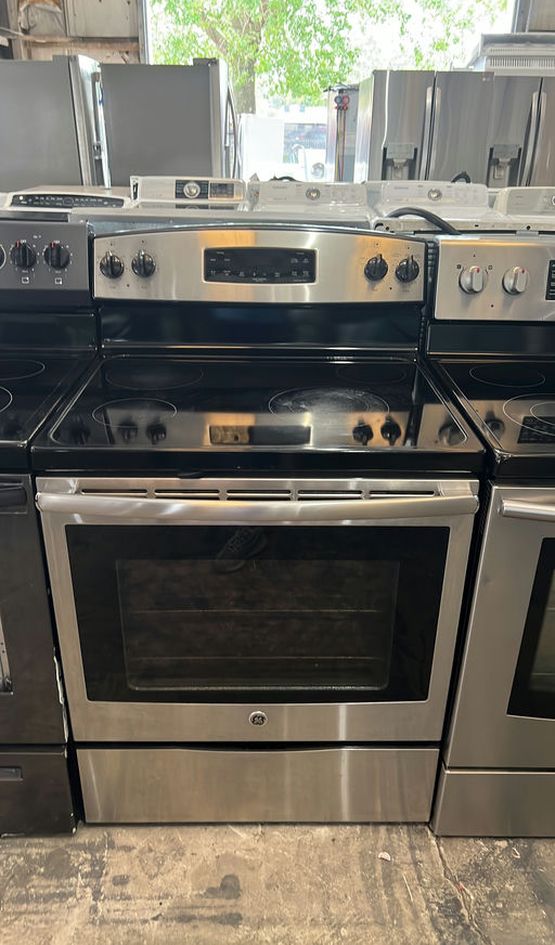 Upgrade your kitchen with this GE electric range in stainless steel. It features a glass top and convection capabilities for consistent cooking results. Condition: The unit has minor surface marks but is in excellent working order. Features include a self-cleaning function, knob controls, and a spacious cooking area. Comes with 60-day warranty Same day delivery available DM / Message us for more info Hablamos español