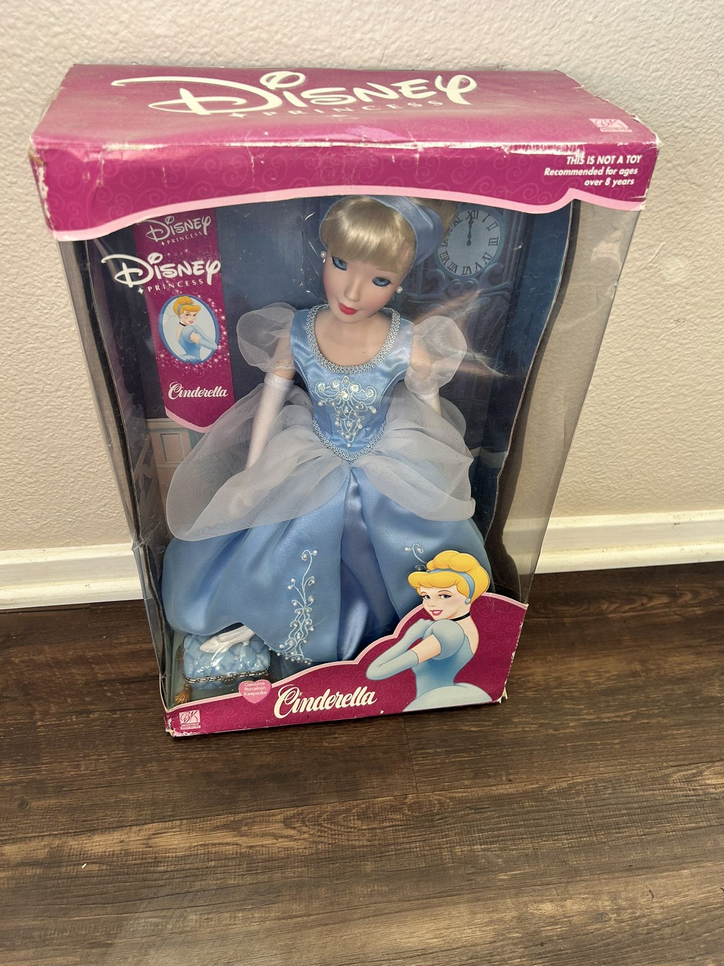 This item is a Disney Princess Cinderella Porcelain Keepsake Doll, a collectible produced by Brass Key Collectibles. Released around 2001–2002, this 16-inch tall doll features a porcelain head and a detailed blue gown adorned with faux pearls and glitter. It was marketed as a collector's item rather than a toy, as indicated by the "Recommended for ages over 8 years" warning on the packaging. eBay eBay +3 Shopping and Value Information The value of this doll varies based on its condition and whether it is "New In Box" (NIB) or "Mint In Box" (MIB). Retailers & Platforms: You can find these dolls through secondary market sellers on platforms like eBay, Mercari, Etsy, and Poshmark. Price Range: $25.00 - $60.00: Common asking price for dolls in good to new condition.