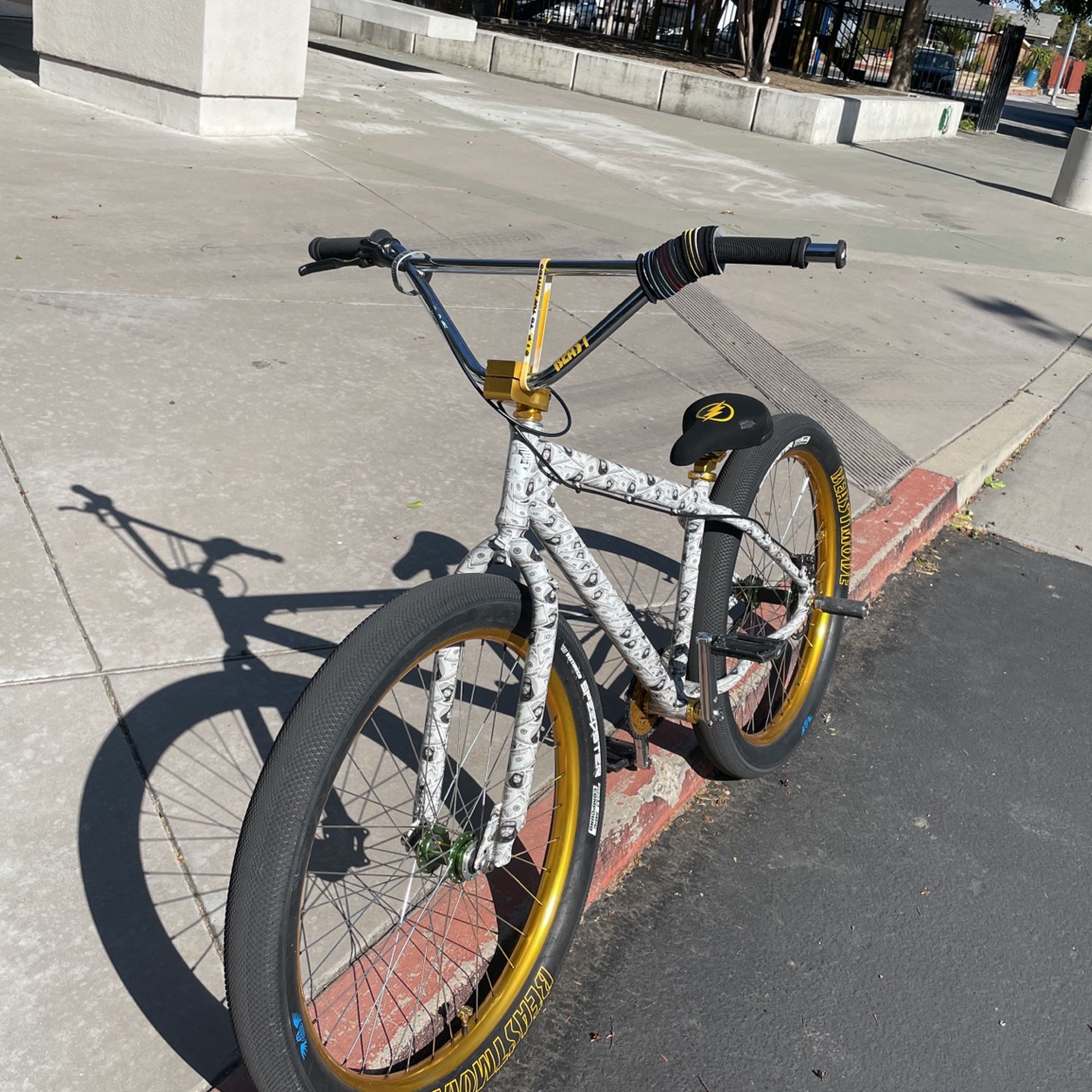 Shimano hydros Chrome super bigs Fast ripper seat with a little rip 8/10 condition Gold chain tensioners Chrome black ops pegs wit grip tape Black fyxation pedals Gold se stem Black odi grips Gold se seat clamp Gold fast ripper seat post Black odyssey chain Hydros are great 1450$ or trades