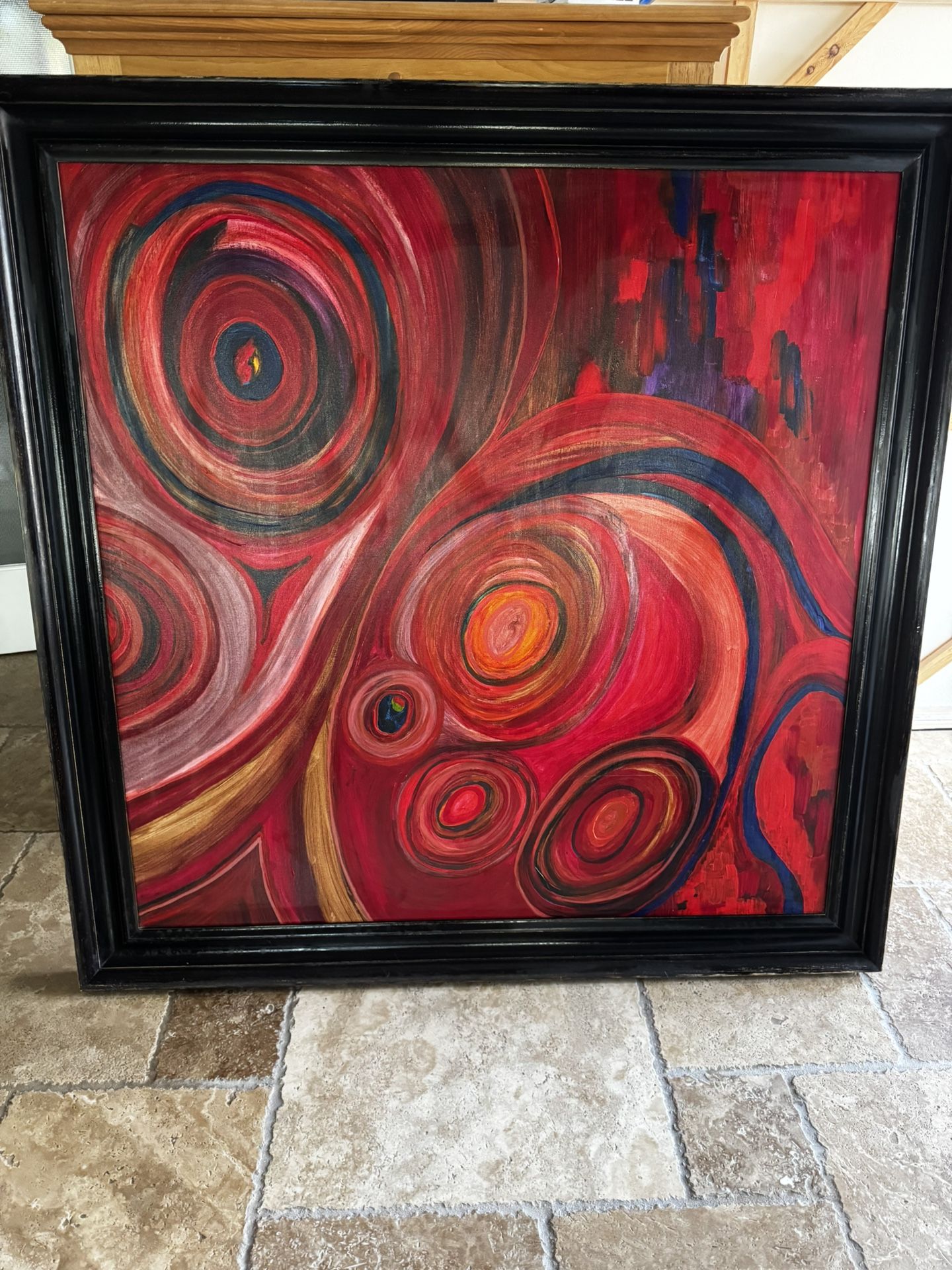 Abstract painted artwork. Red color dominant. Steady Leon wood framing. 551/2inches x 56 inches
