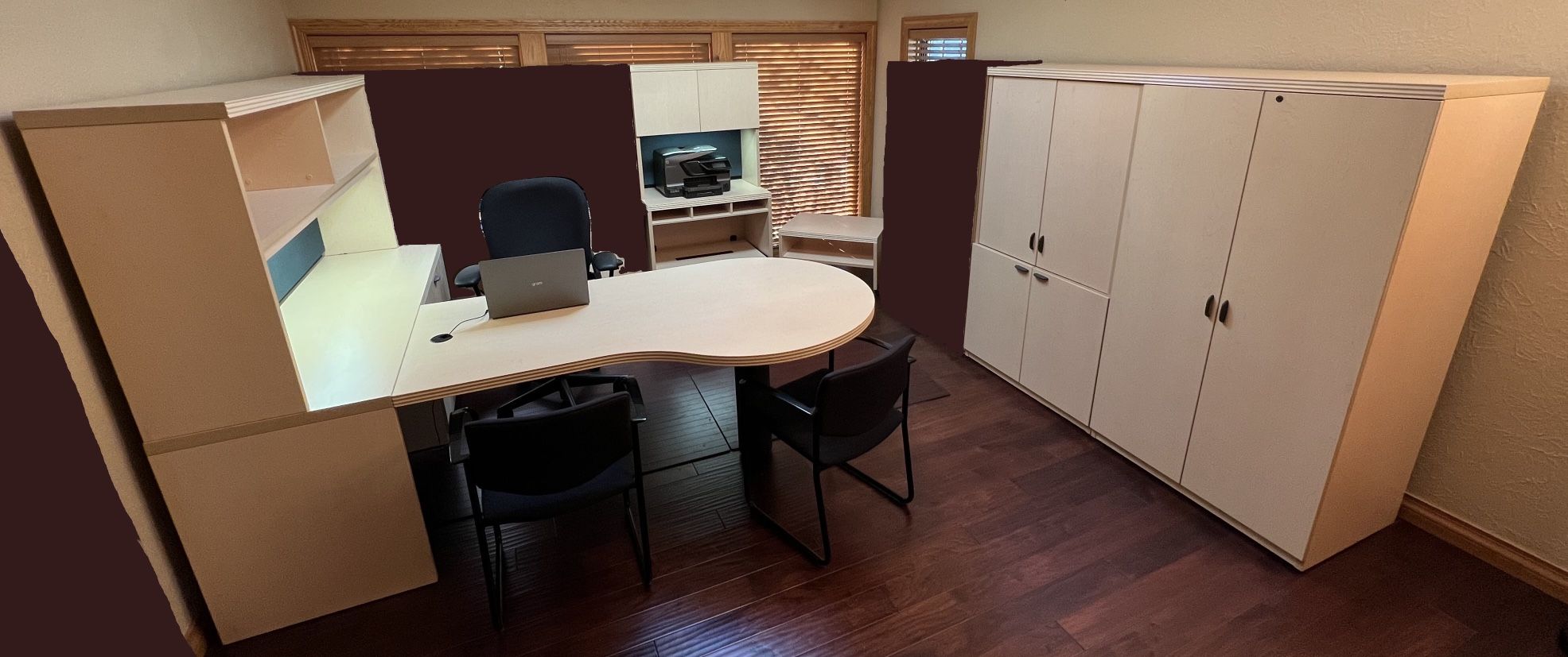 This is your opportunity to enjoy high-end executive office furniture at a fraction of the price! Gorgeous & highly functional Groupe Lacasse 10-piece office / executive furniture set in “Hard Rock Maple” finish from Wilson Office Interiors (a Dallas, TX-based company specializing in the planning & design of strategic workplace environments). Groupe Lacasse relies on cutting-edge production techniques, impeccable materials, & first-class hardware. Sturdy slides on all drawers, thick protective moldings on most components, decorative surfaces laminated by thermofusion to prevent the delamination common among manufacturers who use ordinary laminates, oversized grommets to handle the modern realities of electronic wiring, etc. Just a few examples of the quality that has made Groupe Lacasse products famous. These items are from The Groupe Lacasse “Concept 70” Collection: Lacasse’s leading collection with thicker work surfaces, protective trim on all edges, decorative molding -Thick 1 5/8” tops -2.5 mm edges -Molded steel handles in anthracite grey finish -135 degree hinges & bumpers on doors -File drawers mounted on full-extension, ball-bearing suspensions. -Extruded PVC top rail and suspension bars in all file drawers. Could be used for home or business In very good condition Includes 3 keys Ideally to be sold together as one set, but we are open to selling each item separately. Overall height: 65.125” high Includes 10 pieces: P-SHAPED WORKSURFACE DESK WITH CREDENZA DESK WITH TWO LOCKING 36” LATERAL FILE DRAWERS AND HUTCH -$775 (~$5,230 value) P-Shaped Worksurface -70.75” wide x 41.375” maximum depth (at p-shaped surface) / 31.5” minimum depth x 29.625” high -Black plastic desk grommet hole/cover for cable management -Drum Base (thick black metal pole beneath p-top for support) Credenza Desk with Two Locking 36” Lateral File Drawers -70.875” wide x 23.75” deep x 29.625” high -Moveable brackets for Letter or Legal size files -Metal drawer interior Open Hutch above Credenza Desk -70.875” wide x 15.75” deep x 35.5” high -Height of opening from top of desk to bottom of hutch shelf is approx. 17 9/16" -Vertical separator creates two storage spaces -48” long task light -Vertical tackboard in forest green fabric -Flexible rubber flap along bottom to allow easy access for cords -Mounted headset/headphone hanger PRINTER TABLE WITH TWO-DOOR HUTCH -$325 (~$1,960 value) Printer Table -35.375” wide x 23.75” deep x 29.625” high -Gliding shelf with paper access opening -Full lower storage shelf -Three storage compartments (for paper reams, etc.) -Two black plastic grommet holes/covers for cable management Hutch with Two Doors above Printer Table -35.375” wide x 15.75” deep x 35.375” high -Ample storage behind doors -24” long task light -Vertical tackboard in forest green fabric -Flexible rubber flap along bottom to allow easy access for cords STORAGE WITH WARDROBE UNIT WITH LOCKING DOORS -$300 (~$1,988 value) -35.375” wide x 23.625” deep x 65.125” high -5 storage shelves: -1 top stationary shelf -3 adjustable shelves -Includes optional metal hanging bar & brackets to hang clothing -Two full doors that lock TV / AUDIOVISUAL CABINET -$400 (~$3,432 value) -35.375” wide x 24.625” deep x 65.125” high -2 fold-away upper doors open that retract/slide back for optimal TV viewing, including: -Sliding / turning shelf for TV (32” TV is pictured; likely could accommodate a 36” TV) -Attached hanging upper shelf for other media device(s) -2 rear black plastic grommet holes/covers for cable management (behind TV shelf & behind upper hanging shelf) -2 lower doors: -Right side features three 21” storage shelves (2 are adjustable) -Left side features two 11.25” storage shelves & storage drawer with three compartments for media accessories -Rear black plastic grommet hole/cover for cable management UTILITY TABLE / COFFEE TABLE -$80 (~$400 value) -29.5” wide x 21.625” deep x 17.75” high -1 lower shelf -4 black rolling casters TWO CHAIRS -$75 each (Now selling online for over $200 used) -Steelcase Player Sled-Base Side Chairs -24” wide x 18” deep x 30.25” high each -Black fabric chairs with sleek black plastic arms & frame Finding them on the used market as second-hand office chairs allows you to easily afford a reputable, high quality Steelcase Chair that costs a pretty penny if you buy them new. This is a great, sturdy side chair & the slim profile & simple aesthetic will fit just about anywhere. All measurements are approximate. Included items are listed above. Electronics & accessories pictured are not included. Pieces are in overall very good condition, with normal cosmetic wear (some marks/scratches & imperfections). Smoke free & pet free home Buyer to supply labor to carry thru office door, down hall, out double doors, down long curved front walkway, load onto your own truck