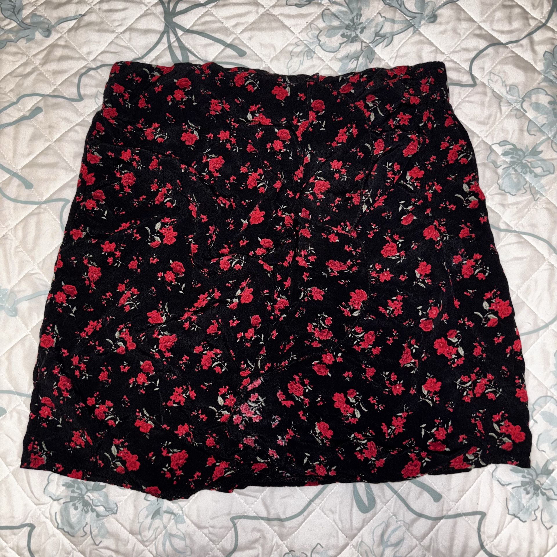 Black mini skirt with a red floral print, lightweight, one size fits most (elastic waistband with stretch), easy to dress up or down, from American Eagle’s “Don’t Ask Why” line, has a side ruffle #floral #miniskirt #summer #casual #coquette