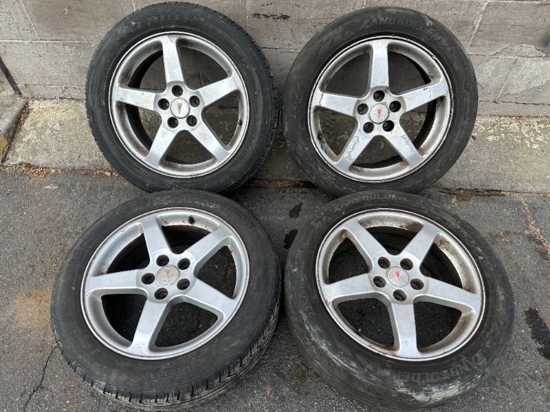 This is a set of four original Aluminum 17x7 inch wheels from a 2005 through 2009 pontiac g6 car. The lug pattern is 5 on 110mm which fits a few different GM cars including some Chevy Cobalt, HHR, Malibu, cadillac Catera, and Saturn L series. The wheels are in good condition with no bends, cracks, or significant damage. The tires are old and mismatched, and should all be replaced.