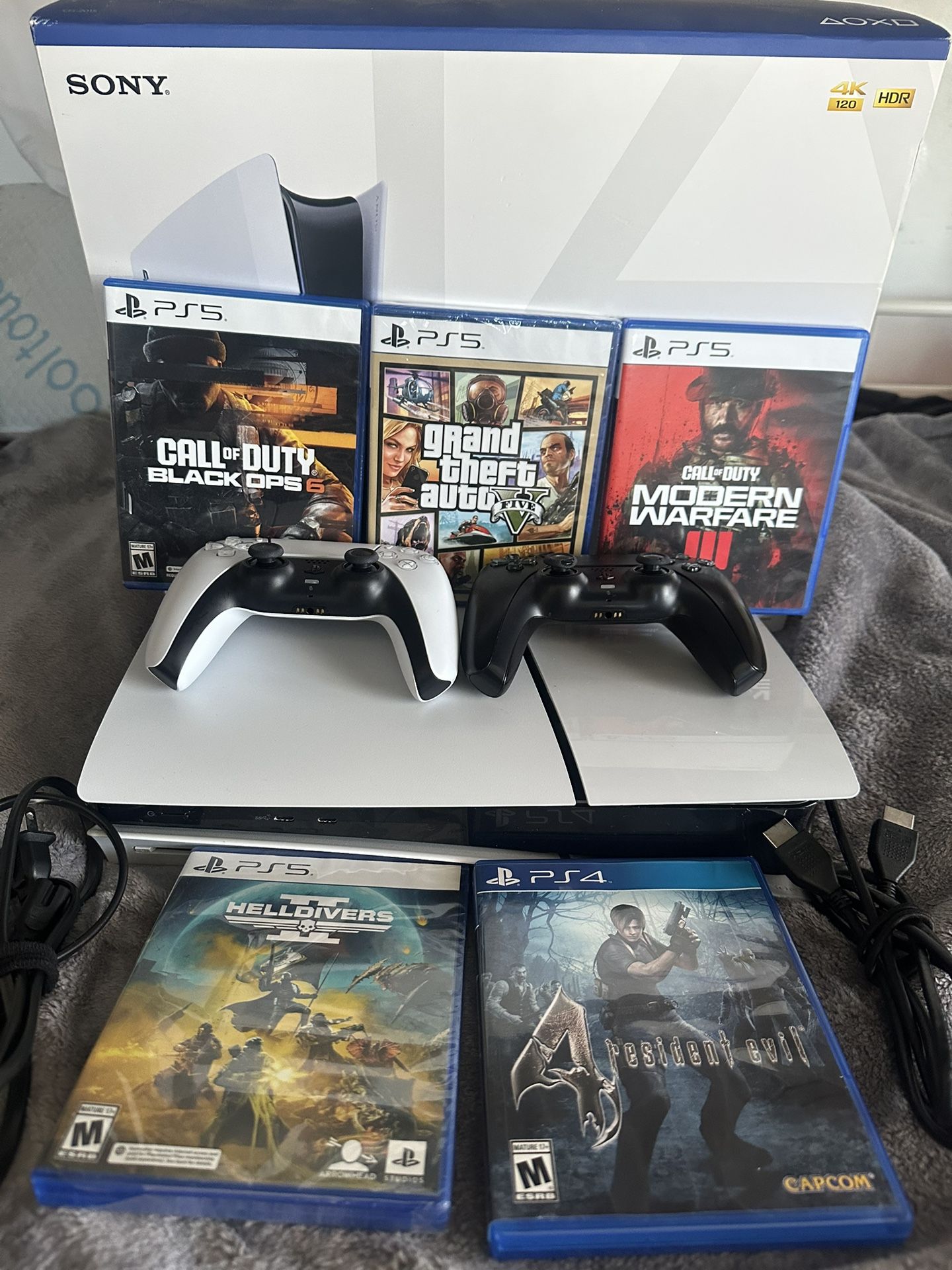 Everything you need for the ultimate gaming experience, all in one package. I’ve taken excellent care of this console since day one, it runs perfectly, looks brand new, & is completely free of dust or issues. “Adult owned”, in a smoke free home. What’s included: PS5 Slim 1TB + original box 2 Wireless Controllers 5 Games Total (2 are still Sealed/New) All original power & hdmi cords