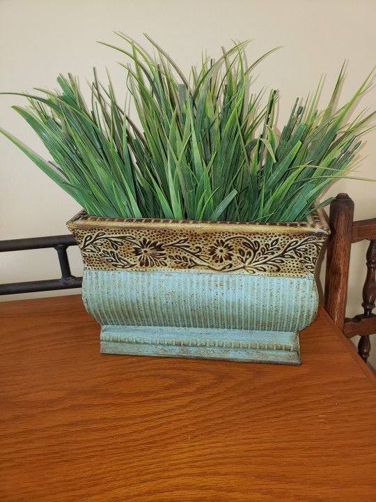 Aqua-greenish & Brown Metal Planter/Container With Faux Greenery Container Approxmeasurements : 7 1/4" H x 11" W x 5 1/2 D Excellent pre-used condition. Downsized a parent and no longer needed. Local pick-up, Cash only