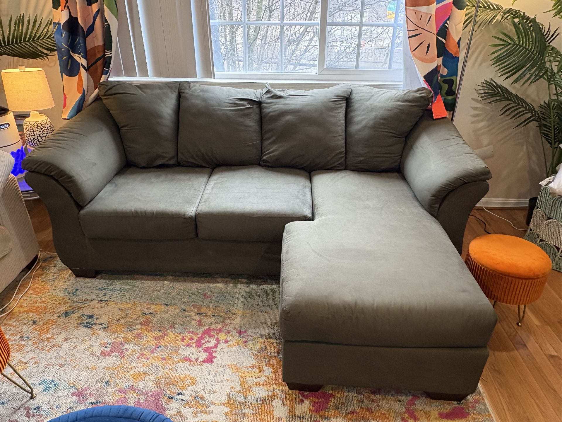 Barely used olive green chaise sofa. Has mostly been covered with this cream sofa cover. Cover can be included or not. Must be able to pick it up. $250 OBO