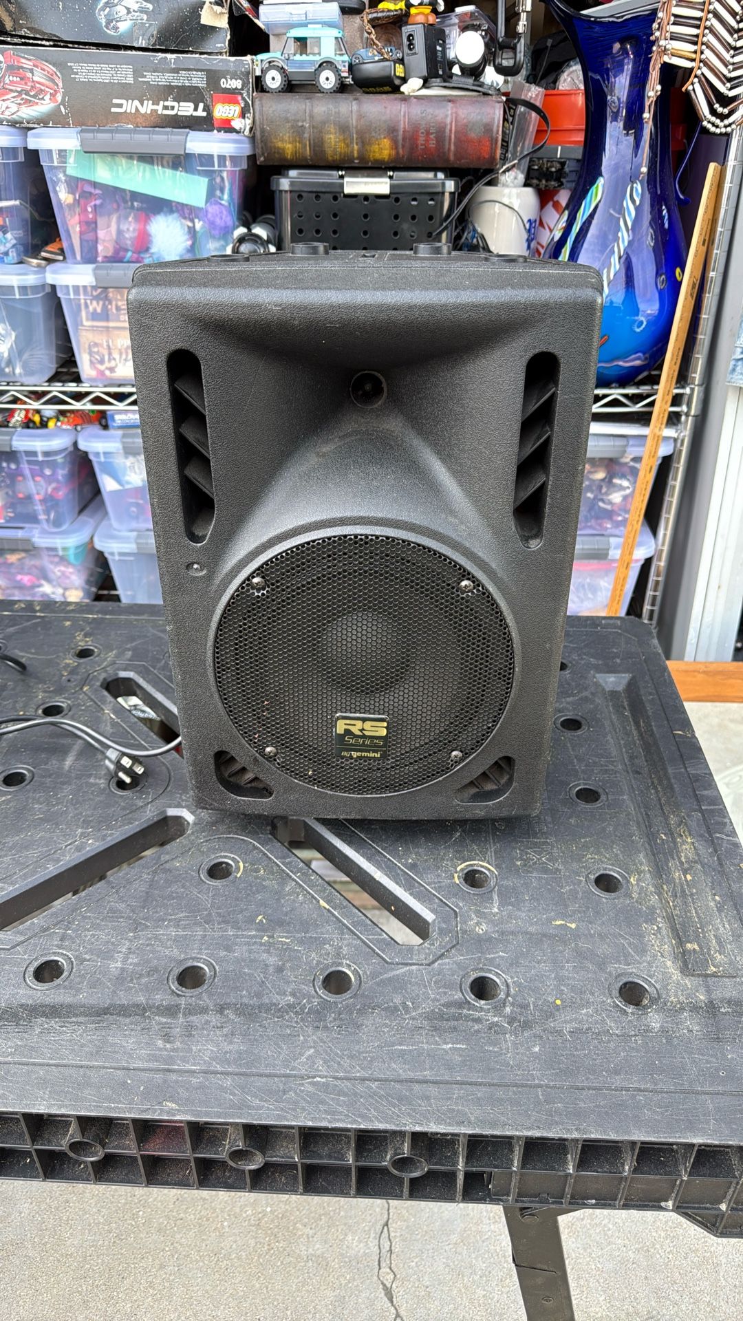 Used but in good condition The 8" Gemini RS-408 2-way high-power active speaker system housing an 8" woofer with 1-1/2" voice coil and a 1" coil titanium compression driver and a built-in 120W amplifier to drive them. It's also equipped with a mixer section that offers XLR and 1/4" mic inputs with separate gain controls, RCA inputs, a 1/4" output connector, and a power guided clip alert LED. The trapezoidal ABS impact-resistant nylon fiber cabinet has a molded horn designed for wide sound dispersion, recessed molded handles, and it is flyable and stand mountable to adapt to your venue. 2-way high powered active speaker system 120W RMS (480W peak) built-in amplifier 8" woofer with 1-1/2" voice coil Compression driver with 1" coil Linear frequency response between 70Hz-18kHz Wide dispersion horn design ABS impact resistant nylon fiber cabinet XLR and 1/4" mic input with separate gain control Line RCA & XLR inputs 1/4" output connector Bass and treble tone control Master volume output control Trapezoidal design Flyable and stand mountable