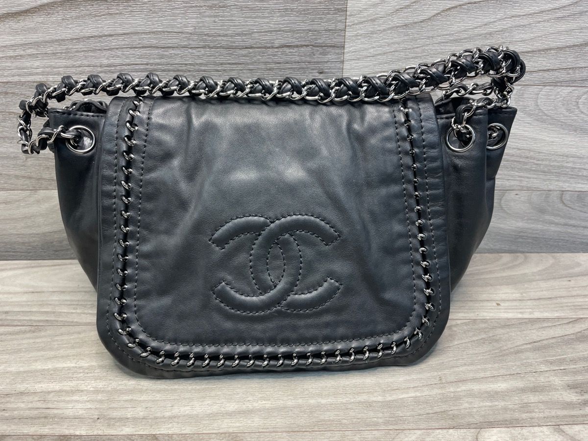Authentic Chanel shoulder bag crafted in soft black leather with stitched CC logo and silver-tone chain-and-leather strap. Features classic quilt-style detailing, reinforced chain trim, and a compact but functional interior. Timeless design that never goes out of style (because Chanel). Good condition with visible natural leather creasing from normal use. Clean, fully functional, and ready to carry.