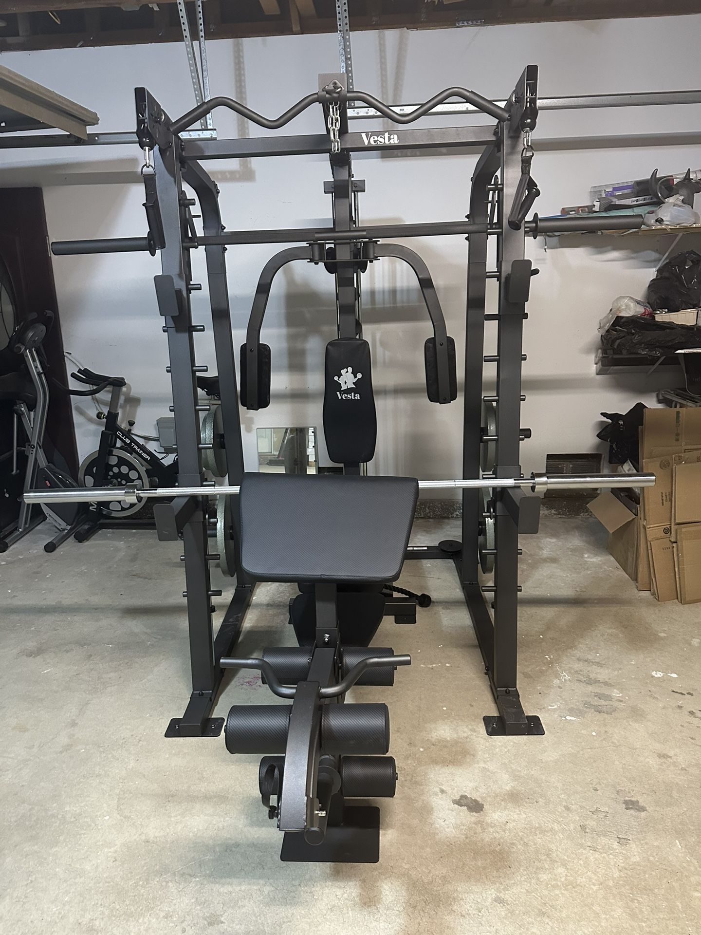 Vesta Fitness Smith Machine 2001 w/Bench Attachment | 230lb Bumpers Weights | 7ft Olympic Bar | Fitness | Gym Equipment | FREE DELIVERY 🚚