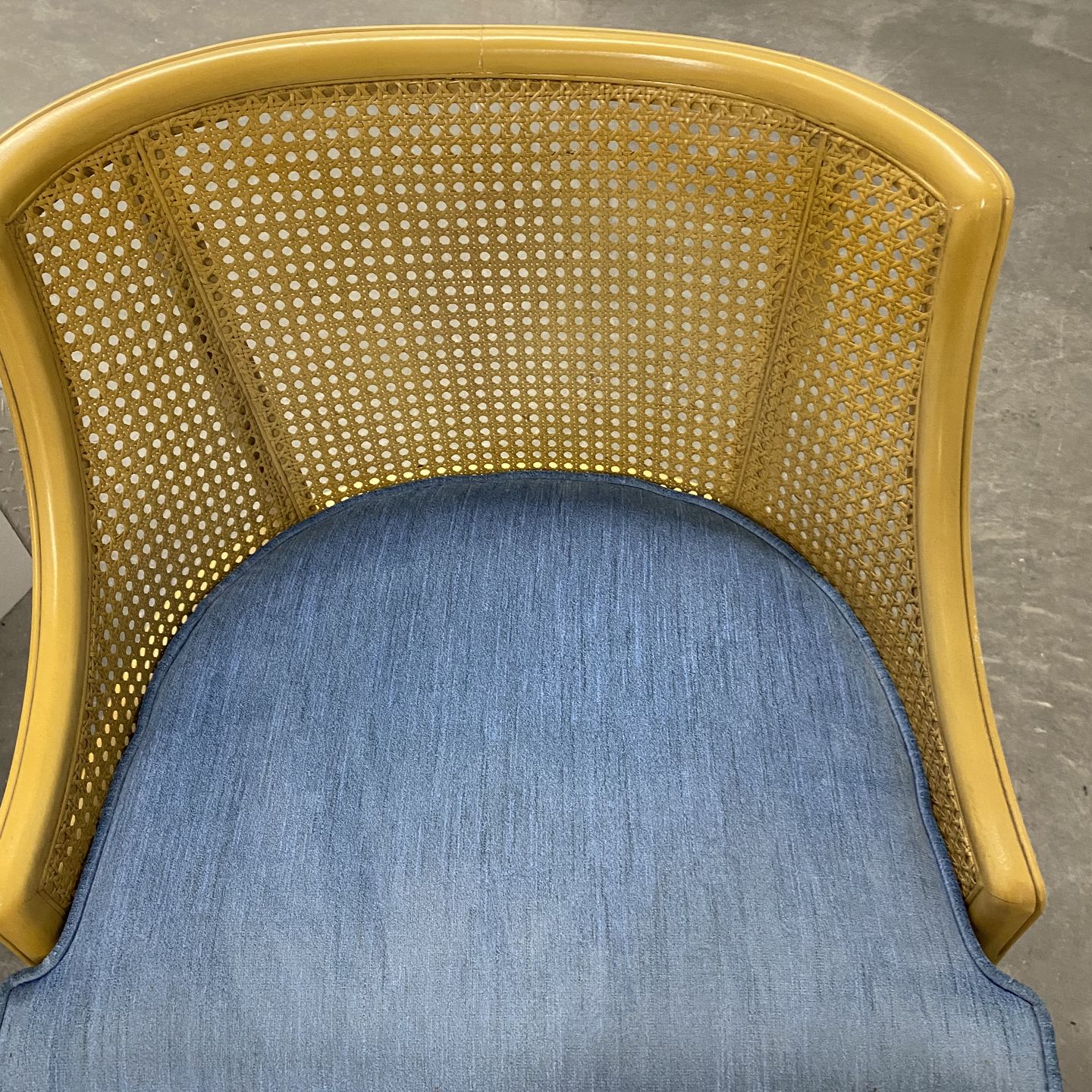 2 chairs! In beautiful condition!!! Cane back curved side chairs. Would be perfect to refinish! Or not. Blue velvet seats- but you can change the fabric to something more modern!