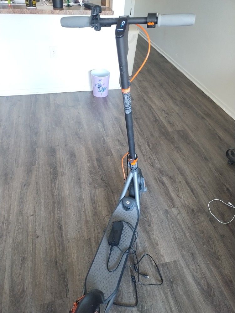 Ninebot Segway electric scooter with a custom handcuff lock with a key for the scooter to lock it up
