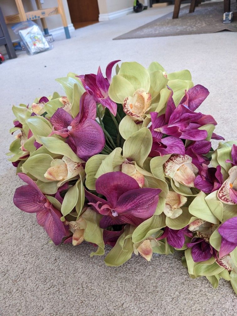 High quality artificial faux wedding bouquets made of vinyl and latex, not fabric. Wrapped with purple ribbon. 1 bridal bouquet and 3 bridesmaid bouquets. These were great for my destination wedding!