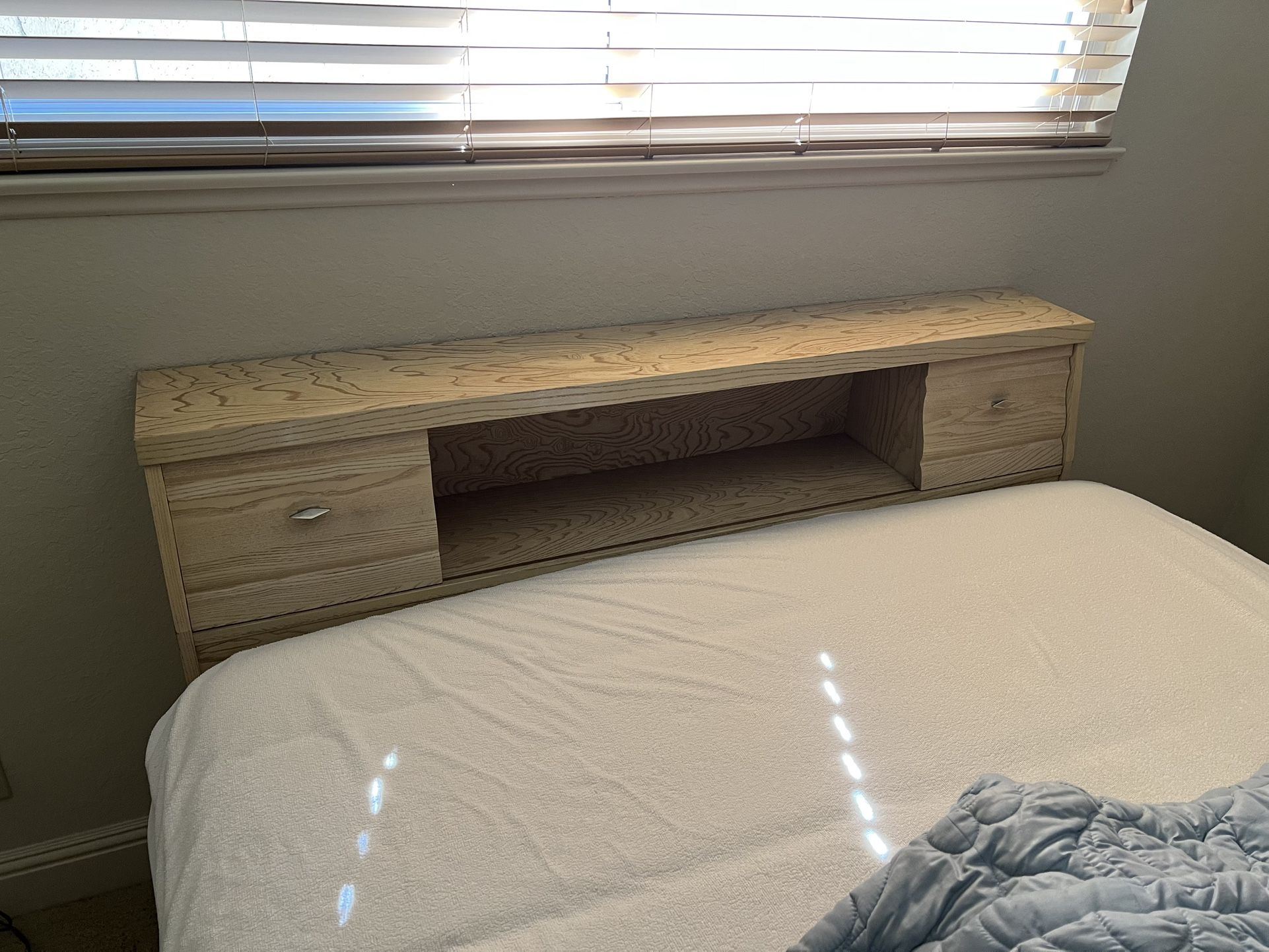 Selling this wood headboard, footboard, and bed frame. It fits a full size mattress (not included) and has storage areas in the headboard