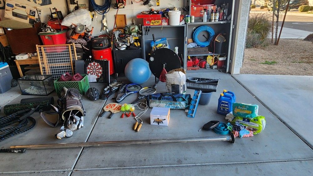 Pet vac,ufc kick bag, 10 gallon,fish tank with lighted top and filter; some decor. Workout rope. Small dog outfits. dance pole. Tennis rackets, golf clubs. $1 -$50. Make an offer for each or all.
