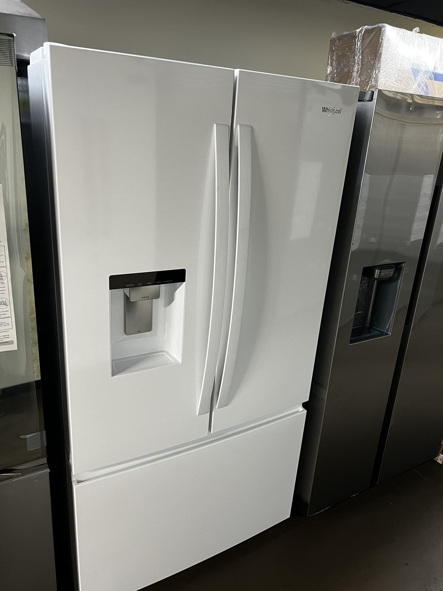 FLOOR MODEL WHIRLPOOL FRENCH STYLE FULL SIZE GLOSS WHITE WITH EXTERNAL WATER/ICE WARRANTY INCLUDED 90 DAYS DELIVERY, HAUL AWAY AND IN HOME INSTALLATION IS AVAILABLE AVAILABLE FOR IN PERSON VIEWING FINANCING WITH SNAP FINANCE