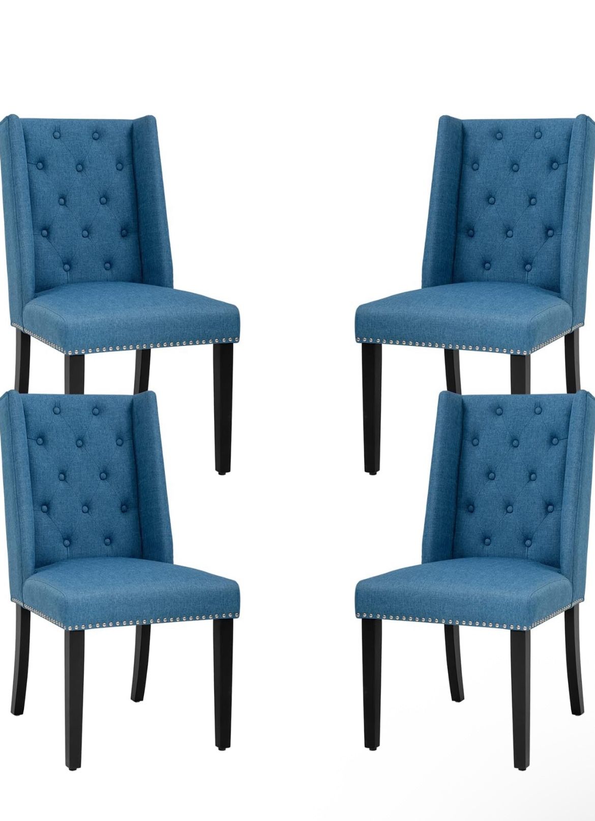 4 dining chairs with studded detailing and wooden legs and blue fabric seating. Kept in good condition. Retails for $280