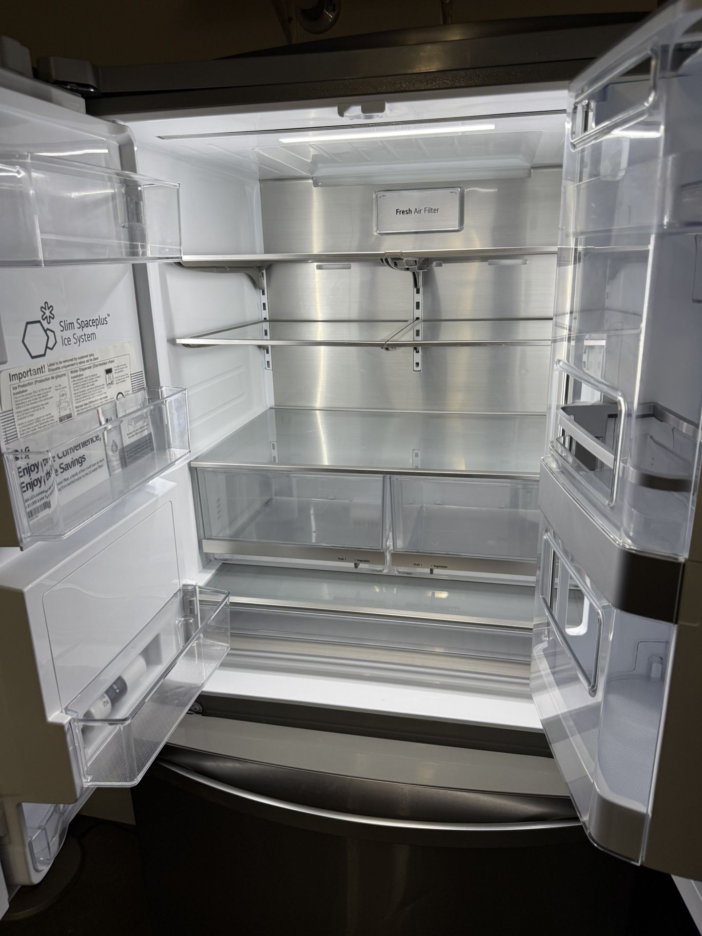Almost 3 years old, transferable extended 5 year warranty thru Lowe’s. No problems, it got a few dents during the move so it was replaced. Works great, will leave plugged up for buyer to verify function. 2 ice makers, air and water filter are due for replacement. Extra door to grab quick items without opening full fridge door. Best offer takes it